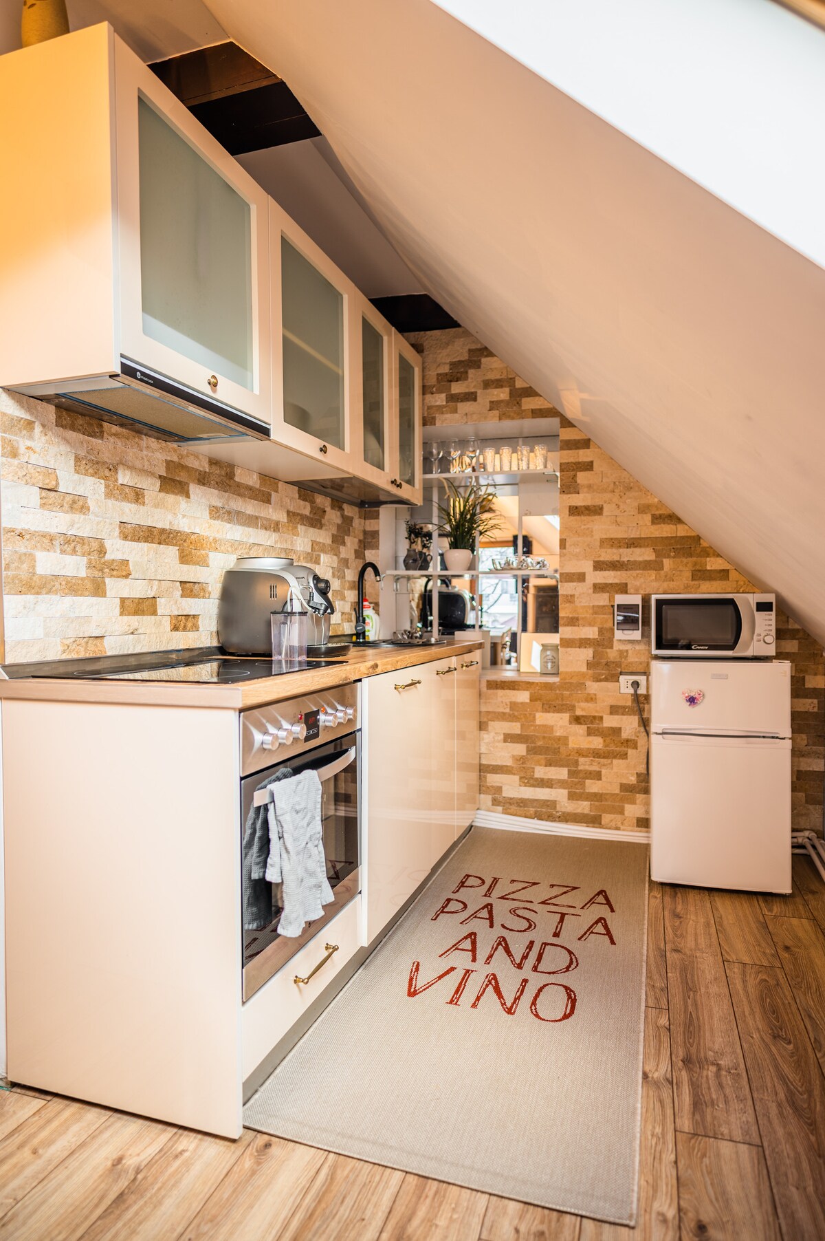 Jabulela ukuhlala okuthulile, okuphrayivethi kule studio esesophahleni e-Vila 1 yase-Hanul Anei, efanelekela ngokuphelele izithandani noma imindeni emincane. Istudiyo sinombhede ophindwe kabili, usofa oyibhede olinganiselwa izivakashi ezingu-2, ikhishi elinakho konke, indlu yangasese ephrayivethi, kanye nevulande ephrayivethi. Ukusuka efasiteleni elisophahleni, jabulela ukubuka izintaba ezinhle ngesikhathi uphumule. Phuma uye egcekeni, paka imoto yakho ngokuphephile, bese uhamba ubuka izindawo ezikhangayo zase-Brașov. I-Jacuzzi yangaphandle engeyona eyisidingo iyatholakala eqenjini lakho (€40/ngosuku, kumelwe ubhukhe kusasele amahora angu-48).