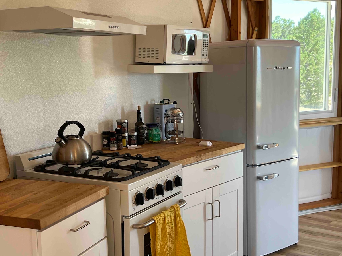 Izindawo ezinhle zezintaba namachibi etendeni lethu elinobubanzi obungu-30! Ukufinyelela ekuqwala izintaba, ukuhamba ngebhayisikili, ukudoba, nokunye. Okokuzithokozisa kwangempela okungaphandle kukagesi okuhlanganisa i-600w yelanga ekhokhisa i-Yeti Goal Zero futhi inika amandla ifriji, i-Starlink, nokunye. Inawo wonke amasevisi: ikhishi elinakho konke, i-heater, i-porta-potty esayithini, i-shower e-yurt, i-queen size bed ku-loft, i-queen size futon engu-1, indawo ye-yoga noma ukuphumula nje. Kulungele noma ubani ofuna ukuhamba, umsebenzi