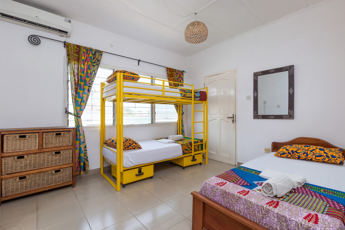 Hlala ebusuku enkabeni ye-Accra endala enomlando! Yizwa ukushaya kwedolobha, amamitha angu-50 ukusuka ebhishi. Igceke lakho elingemuva yi-Ussher Fort, i-Usshertown, i-Makola Market, i-Jamestown lighthouse nemakethe yezinhlanzi. Silungisa lesi sakhiwo somlando, i-Tarquah House, ebungaza i-Jamestown Cafe, i-ArchiAfrika Gallery futhi manje ihostela elisha legumbi elingu-8!