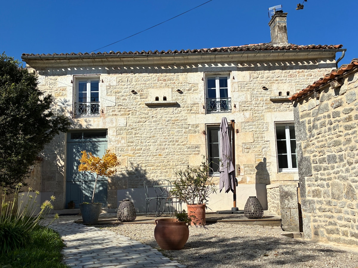 Welcome to our beautifully restored traditional 19th-century pigeonnier gîte in the heart of Cognac’s Grande Champagne region. Carefully renovated to offer a spacious open-plan layout with air-conditioning & a pellet burner, suitable for all seasons. Designed for your ultimate comfort, every detail has been crafted to ensure a memorable stay, from modern amenities to those charming rustic touches. Perfect for those special celebrations or a rejuvenating getaway. The ultimate retreat for 2025.
