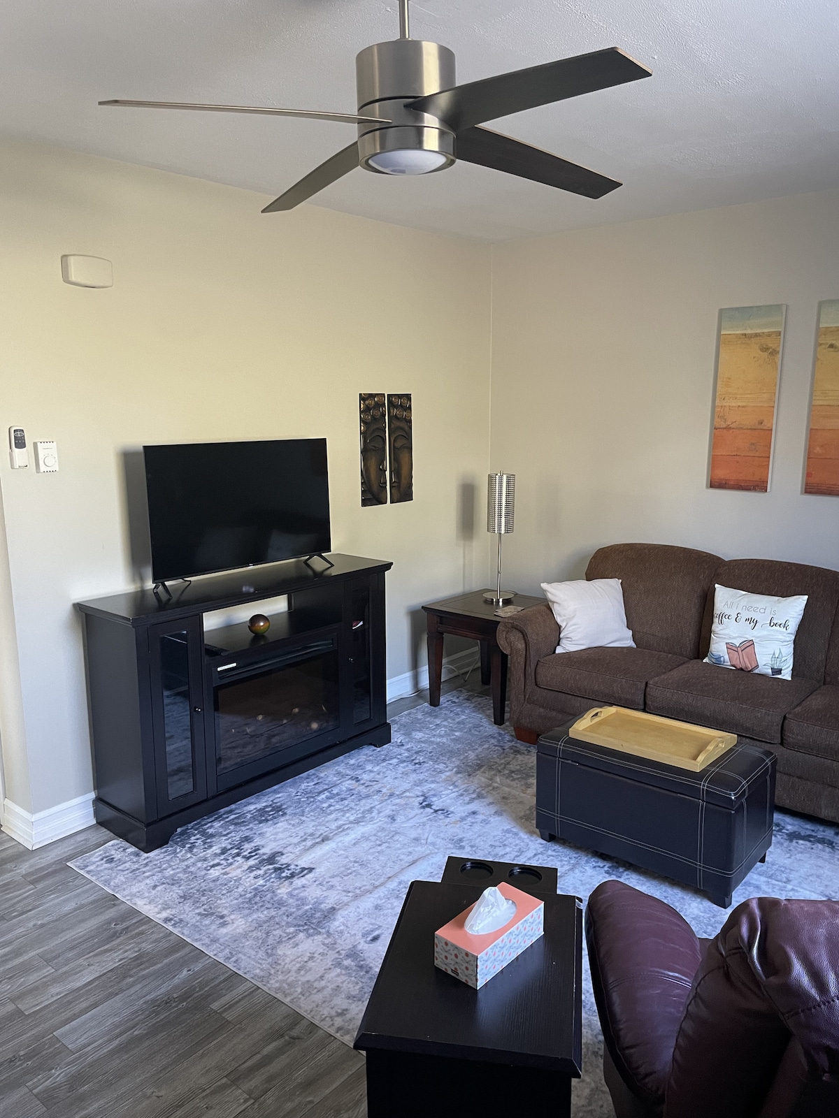 I-2-Bedroom enhle, ekhanyayo enamathani endawo yokuhlala. Idekhi enkulu, i-bbq nobhavu wamanzi ashisayo kuyatholakala ngo-9 am - 9 pm. Ibanga lokuhamba ngezinyawo ukuya e-Tim Hortons, e-Starbucks nasezindaweni zokudlela eziningi ezinhle. Futhi ilungele umndeni nezingane ezifihlekile zidlala endaweni ngaphandle kwegumbi lokuphumula, negceke elikhulu, elivundile elinesethi ye-swing nomgodi womlilo. Ama-TV amathathu. I-inthanethi yekhebula neyejubane eliphezulu ifakiwe. Abanikazi bahlala esitezi esiphezulu, izivakashi ziyakwazi ukungena kuso sonke isitezi esiphansi novulande ophrayivethi. Indlu engabhemi /engabhemi.