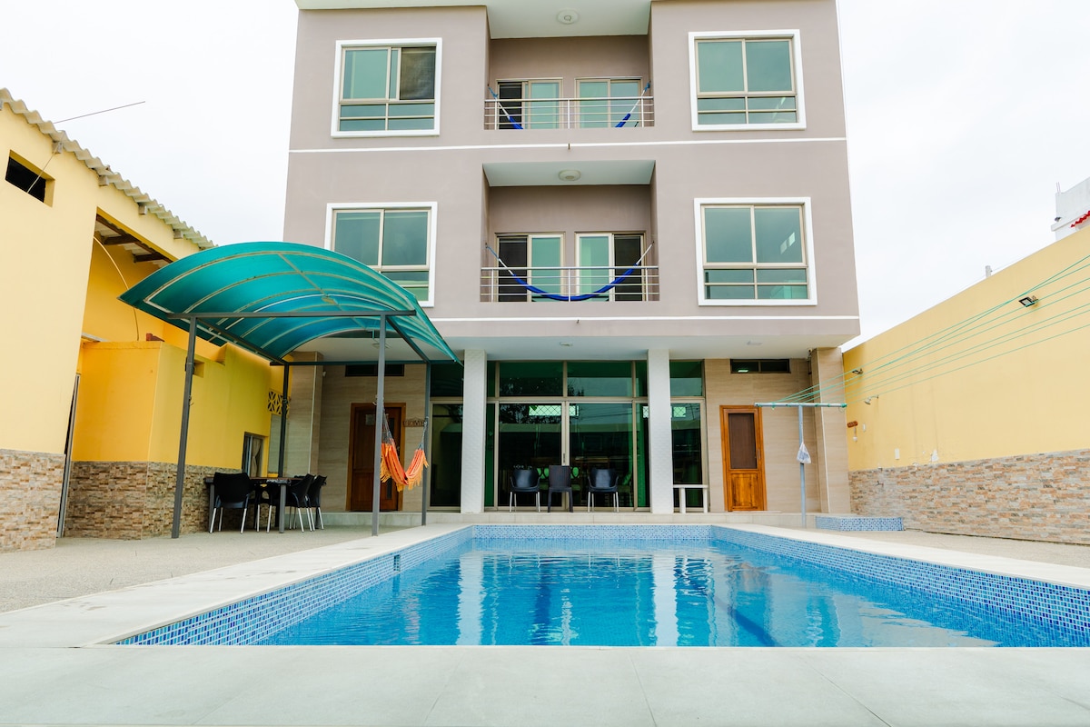 Ikhaya lomndeni elinendawo yokubhukuda, i-BBQ nokuvikeleka kwamahora angu-24
