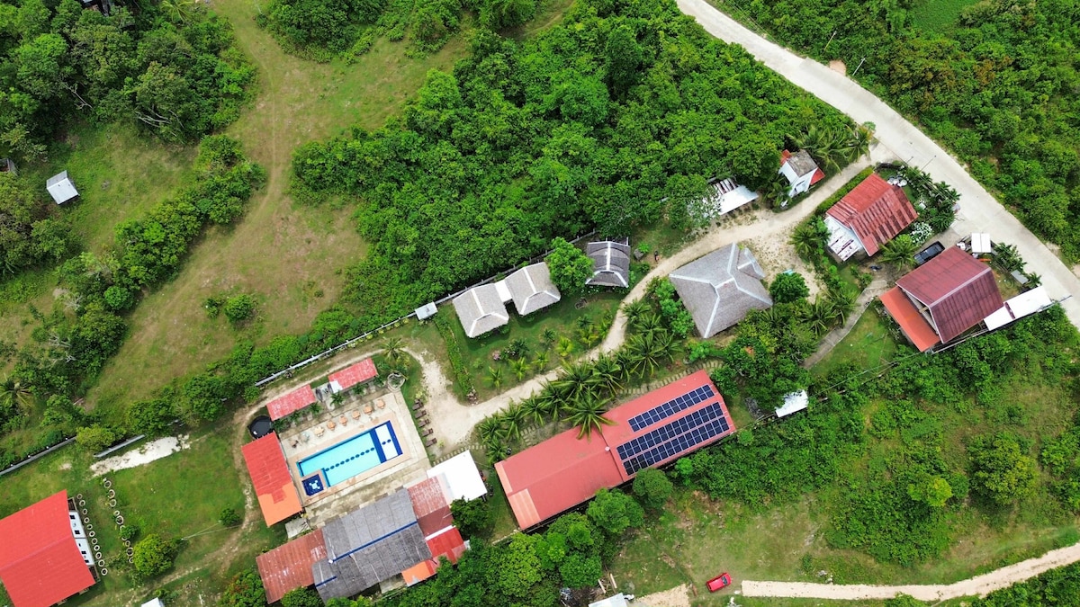 Le ndlu yesitayela esiphindeke kabili inemidwebo yasendaweni yasekuqaleni ezindongeni futhi iseduze nendawo yokudlela ethokomele yase-Baha Ba 'r (u-100% wokhuni nomklamo wase-Philippines). Indawo yokuhlala isendaweni engadini evundile engamamitha angu-30 ukusuka emgwaqeni (akukho msindo) futhi ingamamitha angu-40 kuphela ukusuka olwandle nebhishi elincane elingena endleleni enesihlabathi. Ulwandle lunamakhorali amangalisayo futhi ibhishi lihlanzekile. Iyunithi iyindlu eyakhiwe ngenhloso ehlukaniswe yaba izingxenye ezimbili: Umbhede osayizi we-queen I-Air-conditioning ifeni elisophahleni