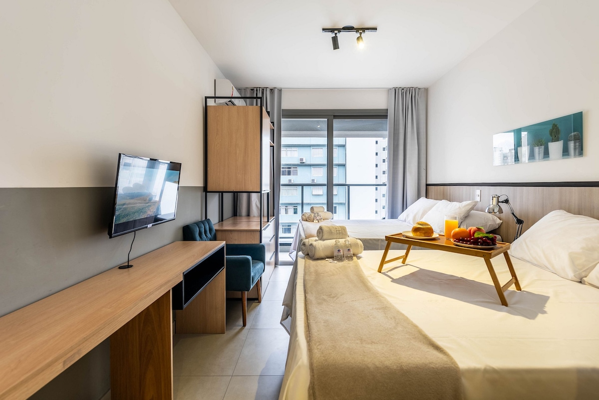 Istudiyo esingu-28m ² esinemihlobiso emihle nethokomele, eklanyelwe izivakashi zethu ukuba zizizwe zisekhaya ekuhlaleni kwesikhashana noma kwesikhathi eside. Indawo ekahle yabantu abahamba bodwa, nomlingani wabo noma nomngane wabo! Sibungaza izivakashi ezingaba ngu-2 ngokunethezeka, isimo sinemisebenzi ehlukahlukene, siphelele futhi sinethezekile. Sitholakala ngamamitha angu-500 ukusuka esitimeleni esingaphansi komhlaba sase-Paraíso KANYE NE-1KM UKUSUKA e-Aclimação Park. E 1 KM ukusuka e-Av. Paulista.