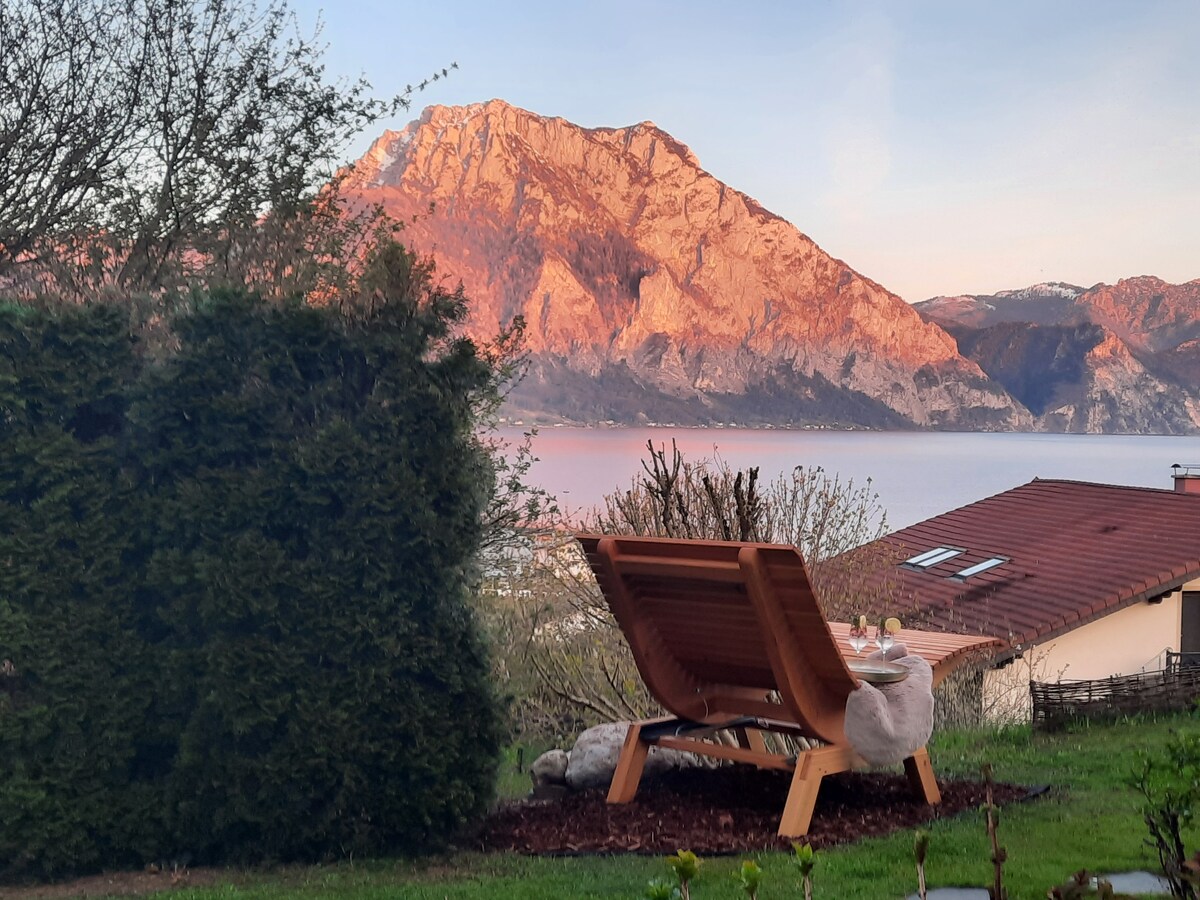 Ifulethi elithokomele elingekude neLake Traunsee e-Salzkammergut, elinemibono ebabazekayo ye-Traunstein, likumema ezinsukwini zokuthula nokuphumula. Ifulethi lisesitezi sokuqala sendlu ehlukanisiwe futhi liyisiqalo esikahle sokuqwala izintaba, uhambo lwezintaba nohambo. Indlu isendaweni ye-cul-de-sac. Indawo yokupaka inikezwa endlini yangasese. Amabhayisikili angakhiywa egumbini lebhayisikili.