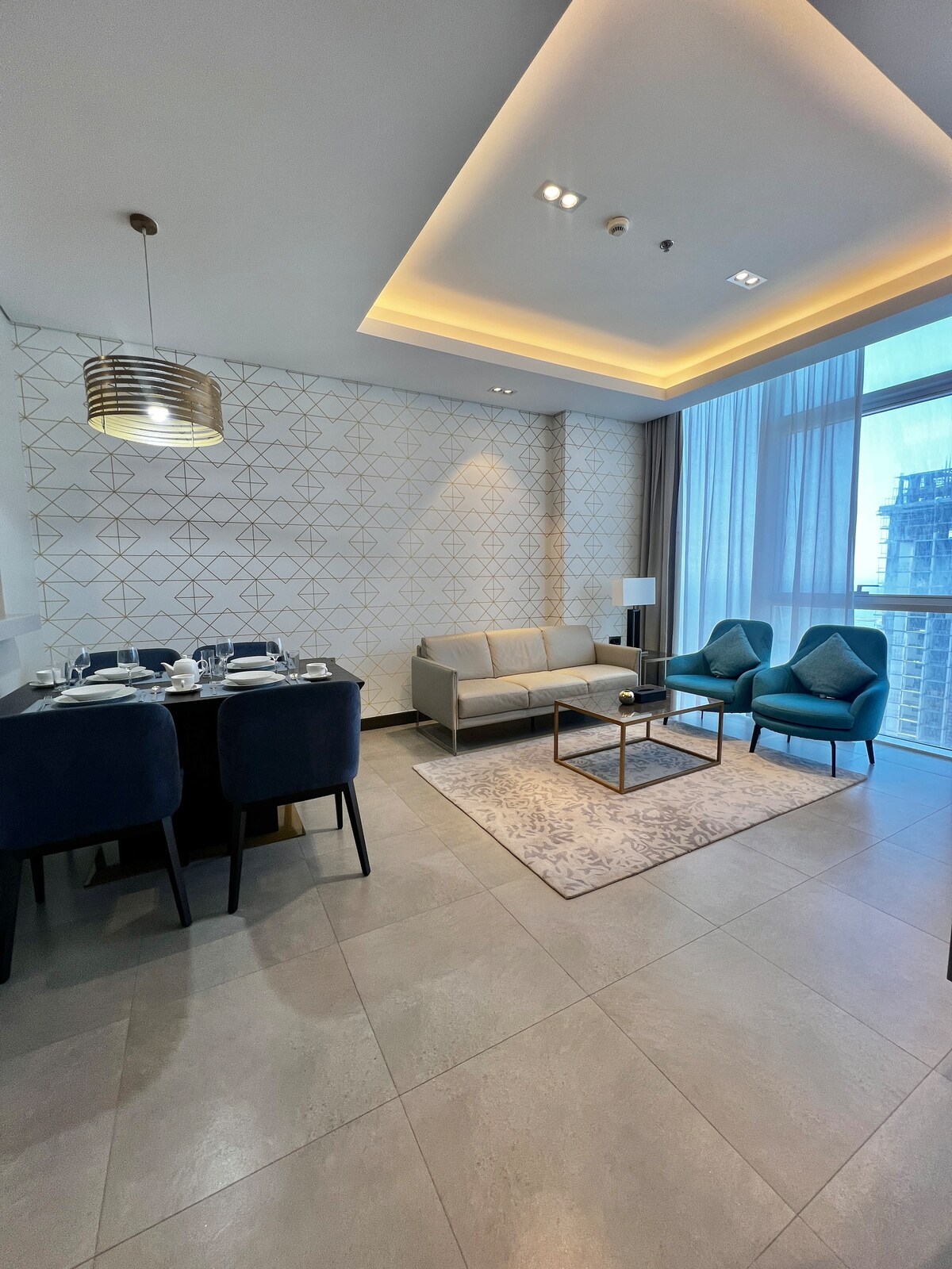 Isitudiyo esinethezekile ngaphakathi embhoshongweni omuhle, esinombhede we-queen, indlu yangasese ephrayivethi enhle, ikhishi eliphelele, umshini wokuwasha, umshini wekhofi onamakhepshuli, ikheji enetiye, i-Wi-Fi yamahhala, nebhalikhoni enendawo yokubuka ulwandle nedolobha. Izindawo: amachibi okugeza angaphandle, ichibi lokubhukuda elingaphakathi, ichibi lokubhukuda elingasese labesifazane, indawo yokuzivocavoca yomphakathi neyangasese, indawo yokudlala yezingane, indawo yokuhamba yangaphakathi, indawo yokosa inyama, ihholo lokuzijabulisa (amabhiliyade ne-PlayStation), indawo yokwamukela izivakashi enobukhazikhazi enepiyano. Indawo iseduze ne-City Centre, i-Al Seef Mall, i-Water Garden, ne-Saudi Bridge. Kulungele ukuhlala noma iholide.