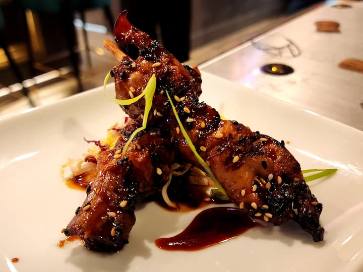 Kusuka endlini eyenziwe isobho le-miso. Amasaladi enzelwe isizini, i-truffle edamame ebandayo, i-sashimi , i-nigiri nama-roll.