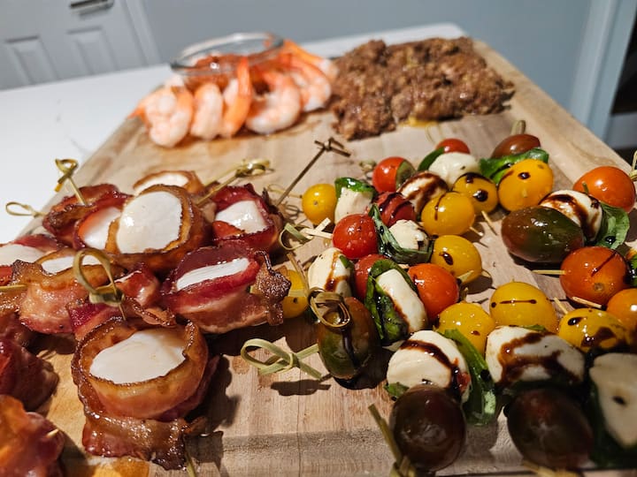 ama-scallops asongwe ngebhekoni. Ama-caprese skewers, ukulunywa kwenkukhu ye-pecan, ne-cocktail ye-shrimp