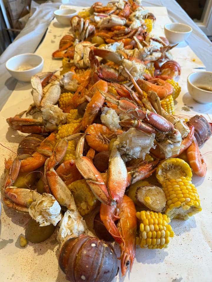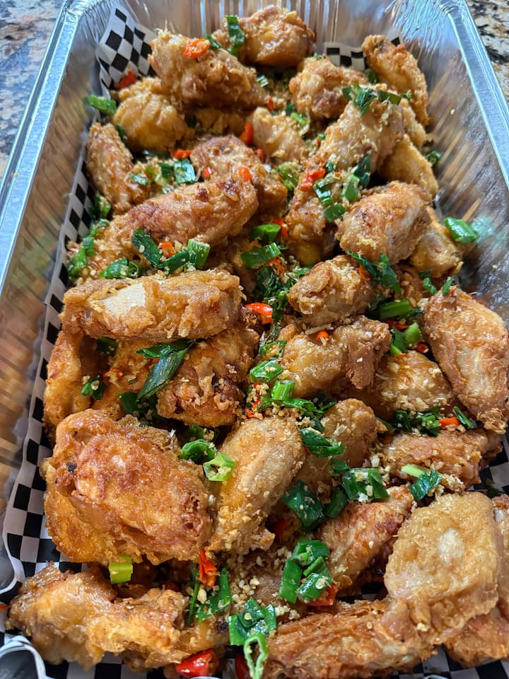 Ukudla kwasolwandle kwasendaweni okunezinongo zebhotela zase-Asia Cajun. Kungcono ukujabulela ngezandla.