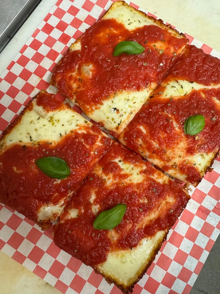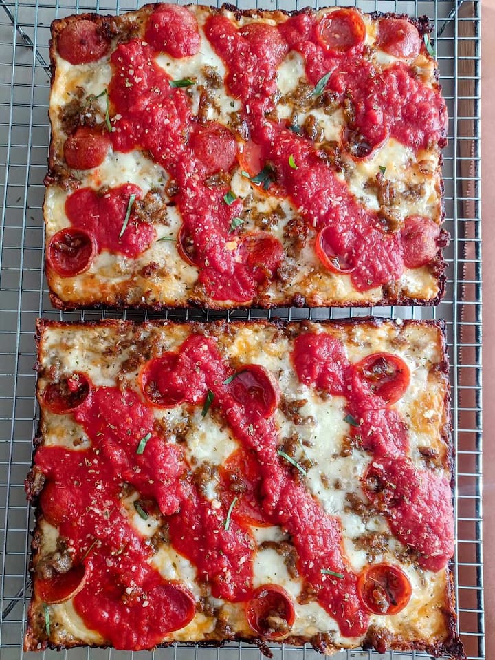 Joyina Ikilasi lethu Lokupheka I-Pizza Yase-Detroit elijabulisayo, elisebenzisa izandla elibungazwa yi-Pizza Squared 843 — ikhaya lase-Myrtle Beach le-pizza ephelele, enomqando, enoshizi, “eyenziwe ngokuphelele ngokudla okusanhlamvu.”