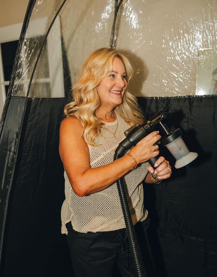 I-Sunkissed Spray Tan esitudiyo esifudumele nesikhangayo esisekhaya esikhethekile sokufafaza isikhumba esibukeka njengokwemvelo. Uqeqeshwe ngabantu abahamba phambili e-La Mesa, u-Alyssa e-Afterglow Beauty.