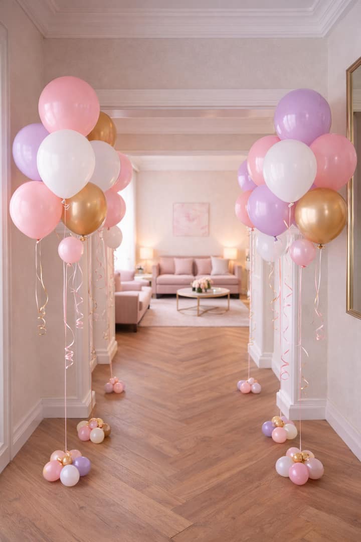 Yenza indawo yokungena ibe yinhle ngokumangazayo ngamaqoqo amabhaluni e-helium ahlelwe endaweni yokuhamba noma endaweni yokungena. Lokhu kulungiselelwa kuhlanganisa izimbali ezingu-6 zamabhaluni ezibekwe endleleni kanye namaqoqo aphansi ahambisanayo. Imibala yamabhaluni iqokiwe ukuze ifane netimu yomgubho. Ilungele izinsuku zokuzalwa, izinsuku zokugubha, ukucela umuntu umshado, noma imigubho ekhethekile.
