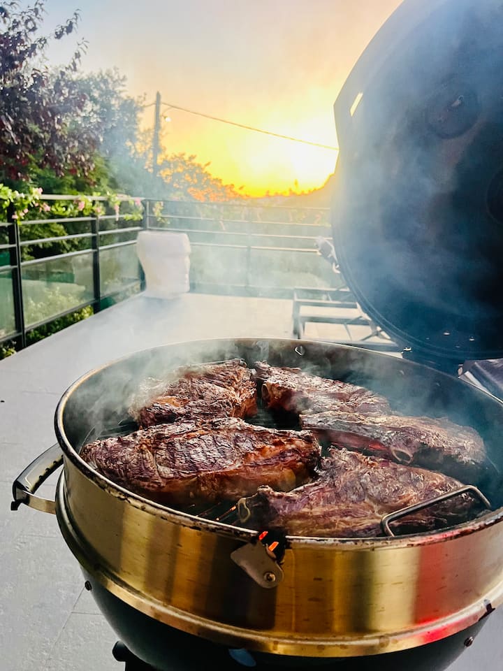 Indawo yokosa inyama eyakhelwe ngokukhethekile endlini, enenyama esosiwe enhle kanye nezidlo ezihambisana nayo zase-Mediterranean. Inyama eyosiwe, amasoso enziwe ekhaya, amasose asunguliwe, inhlanzi yosuku (kuye ngokuthi iyatholakala yini), imifino eyosiwe, amasaladi ezinkathi zonyaka, amazambane amancane ane-rosemary, kanye noswidi wasehlobo. Inani lompheki kuphela. Kuzonikezwa ibhajethi eyengeziwe yezinto ezidayiswa esitolo, ngokuvamile ephakathi kuka-€30 no-€50 umuntu ngamunye kuye ngalokho enikukhethayo.