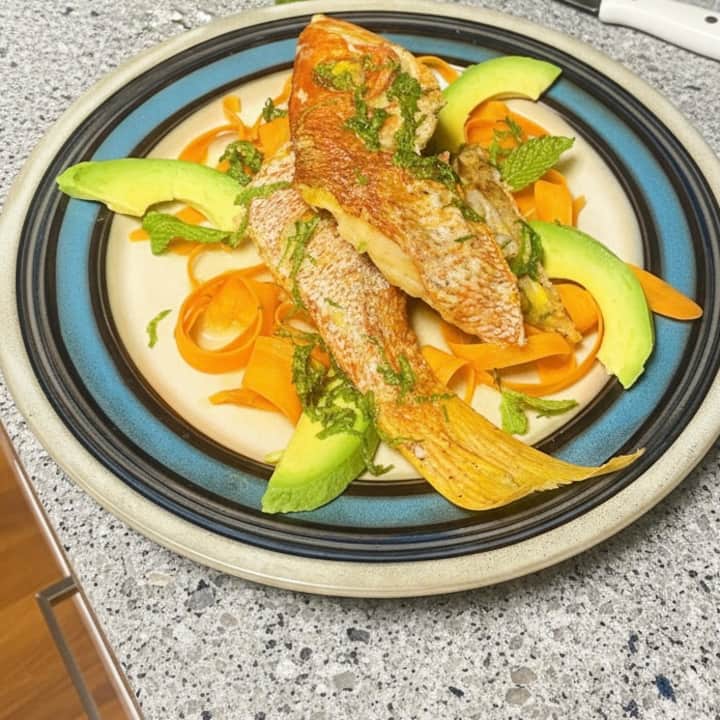 I-snapper ebomvu ephelele, isikhumba esiqothukile, ibhotela lamakhambi. Ikhonzwa ne-avocado nezithelo ezisawolintshi. Kusikwa etafuleni. Yingakho ngingumpheki wamazwe ngamazwe.