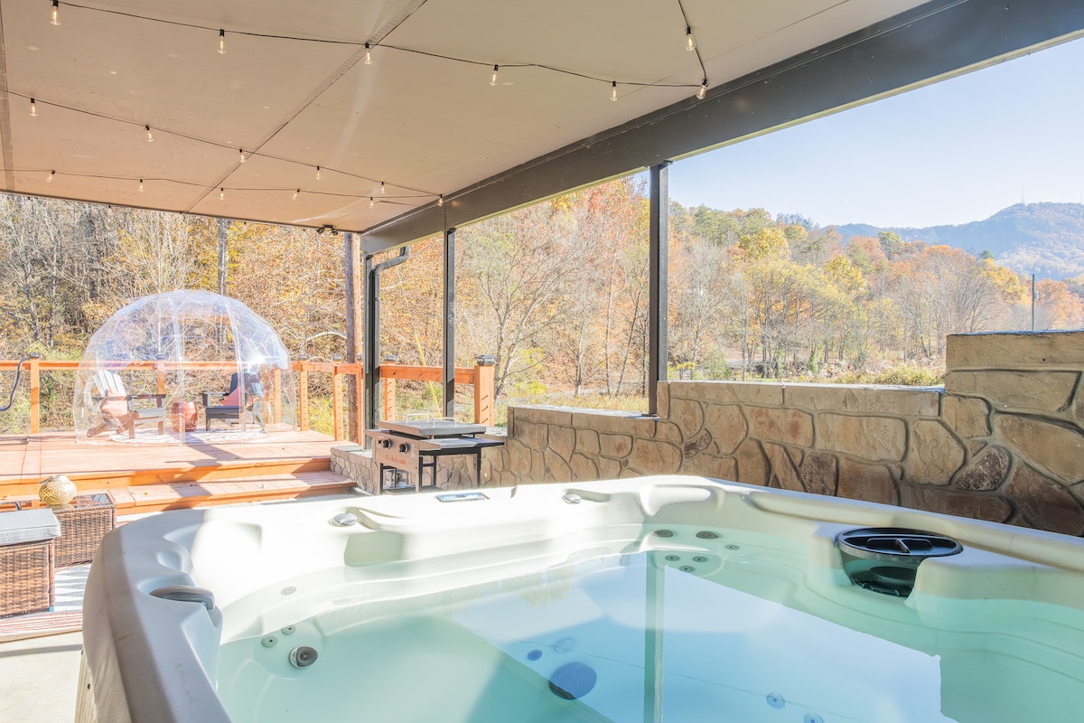 Lo mndeni oseceleni owakhiwe ugqame uzungezwe amahlathi futhi unombono ohlangothini lwezintaba/zezwe. Nge-shower yangaphandle, ubhavu wamanzi ashisayo nesici samanzi uzolahlekelwa ngokuthula nokuphumula. Singabantu drive esheshayo kusuka emadolobheni amakhulu (Pigeon Forge, Gatlinburg, Townsend, Knoxville) futhi The Great Smoky Mountains. 55" I-Smart TV, umbhede wosayizi wenkosi onamalineni asezingeni eliphezulu, amabhavu, izincwadi, ama-vinyls nekhishi elinezinto zokupheka. Ukuzijabulisa kanye/noma ukuphumula kusezandleni zakho e-Aarrams Loft.