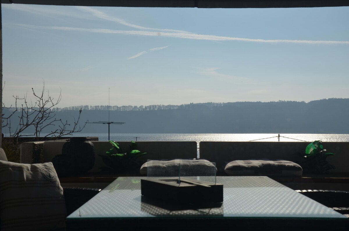 Looking for a relaxing & inspiring lake holiday? Come enjoy our 100% Solar Powered, Modern, Minimalistic Design yet cozy studio apartment in a charming lakeside village with floor-to-ceiling windows with gorgeous Lake Constance views & lush nature greenery, offering a large private outdoor terrace, kitchenette & parking. Featured in "Schöner Wohnen" magazine as "House of the Year", this beautiful apartment was completely remodeled and styled by a locally renowned architect & design team in 2025.