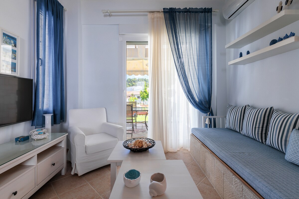 Amamitha angu-30 ukusuka ebhishi (amafithi angu-90) , e-Pliades estate e-Siviri. Indlu ethokomele nekhanyayo i-SMART TV ne-Wi-Fi umshini wokuwasha isiqandisi esikhulu isitofu se-microwave nohhavini i-air conditioning ifakiwe! Ifanele abantu abangaphezu kuka-4, imindeni njll. Esitezi sokuqala esiyinkimbinkimbi. Phezulu kolwandle ngomoya omuhle ebusuku! Amakhilomitha angu-25 ukusuka e-Sani Beach nase-10km ukusuka eKallithea nase-15km ukusuka e-Amytos.