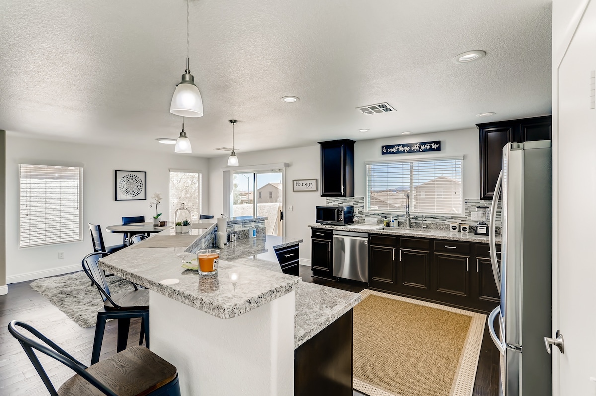 Woza unethezeke futhi uphumule kuleli khaya elivulekile elilungiswe ngokuphelele ngamatafula amasha asekhishini, izinto zikagesi kanye nezitezi ezintsha sha! Izindawo eziningi zokuphumula ezihlanganisa eyodwa eceleni kwekhishi nendawo eyengeziwe phansi enezindawo zokuphumula. Leli khaya linezinto zonke ozidingayo emabhodweni/amapani, izitsha eziningi/izitsha zengilazi, ikhofi, ibhodi le-ayina/loku-ayina, ama-hairdryer, i-BBQ njll. Uma usukulungele ukuthola lokho i-Las Vegas ekunikezayo, i-strip iyi-15 min drive esheshayo -kude ngamakhilomitha angu-10!
