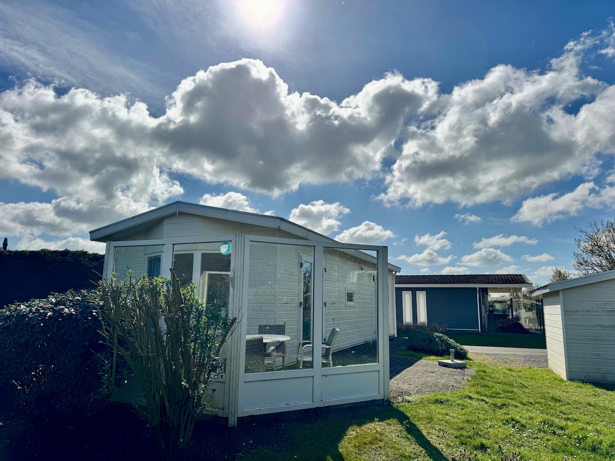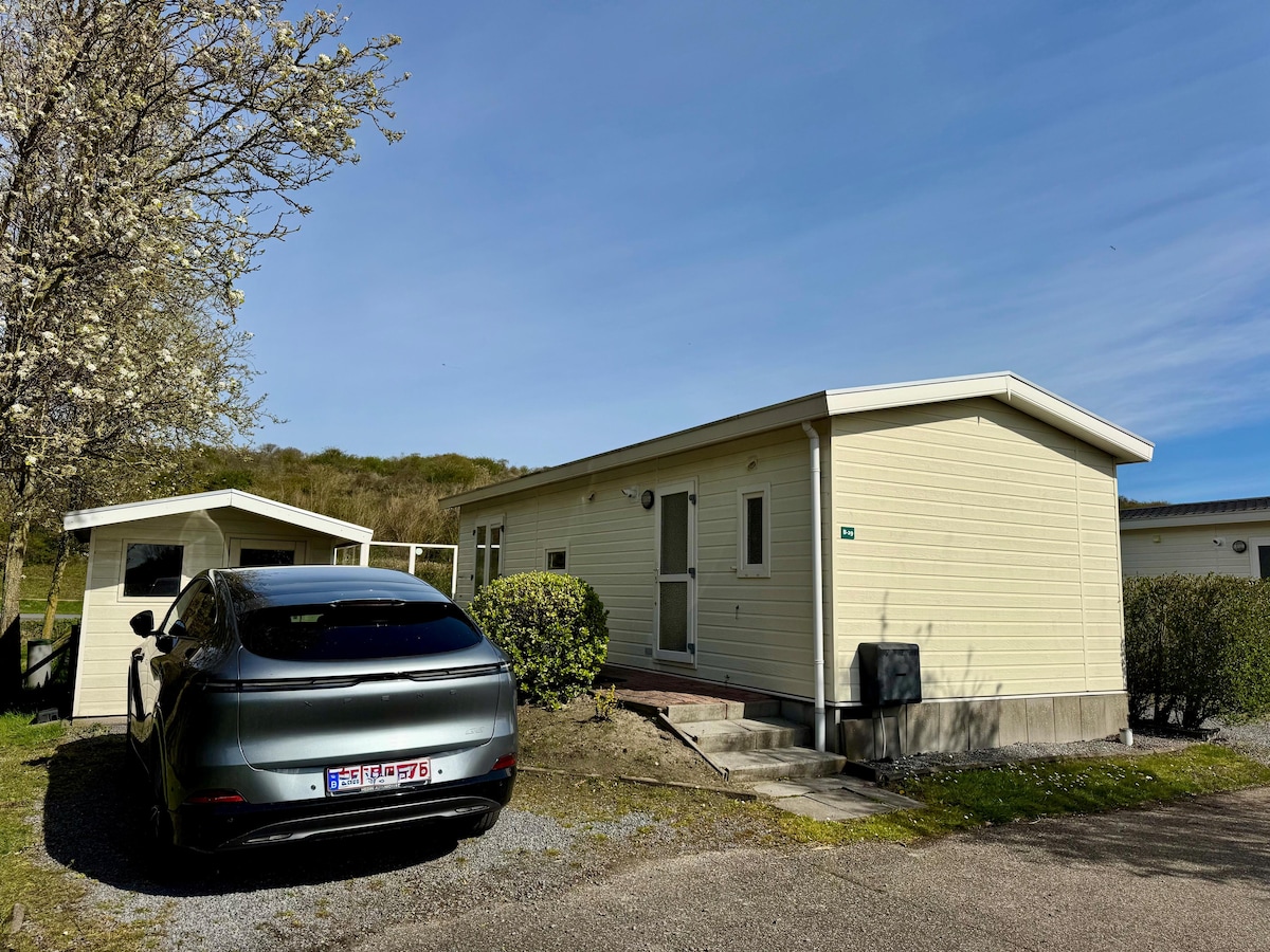 Indlu yeholidi eyakhiwe ngokhuni yabantu abangu-4. Ngasolwandle 🏖 Sun canopy, , lounge set with pillow box, picnic table, round table with 4 rattan chair. I-canopy enomnyango ohambayo Umbhede owodwa nemibhede emibili. Umbhede omkhulu unomatilasi ophindwe kabili onama-duvet angashadile. Kunomntwana otholakalayo. Abekho ababhemayo. Letha amashidi namathawula ngokwakho. Ingahlinzekwa futhi yithi ngemali engu- € 15 umuntu ngamunye. -> isicelo lapho ubhukha. Ubuncane bobusuku obungu-2. Ufika kusukela ngo-1 ntambama,uhamba ngaphambi kuka-12 ntambama
