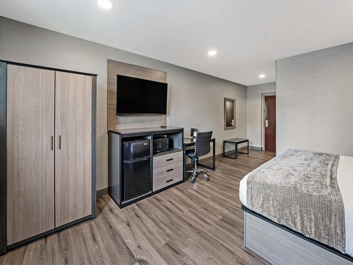 Siyakwamukela ku-Boutique Room yethu enhle enemibhede emibili ye-Queen, efanelekela kahle iholide elithokomele lababili. Le ndawo ekhangayo engu-300-400 sq. ft. inesihlalo sokuphumula esithokomele, isikhungo sokwamukela izivakashi esinefriji, i-TV eyisicaba, nomshini wokwenza ikhofi we-Keurig onenkomishi eyodwa. Ngedeski lomsebenzi nesihlalo esizinikezele, iyindawo ekahle kakhulu yokuphumula nokunethezeka!