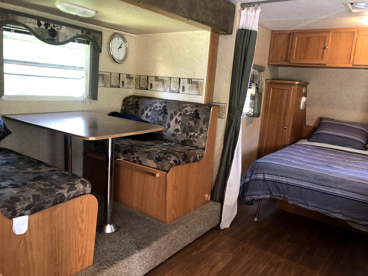 Le RV ithokomele kakhulu kubantu abadala abangu-2 nezingane ezingu-2, ngenxa yemibhede engu-2 iyimibhede emincane, 32" x 70". Itafula liyashintsha libe umbhede ogcwele, ongcono kakhulu kumuntu omdala ongu-1 futhi kukhona umbhede we-queen ontofontofo kakhulu onomnyango wobumfihlo. Wonke amasevisi alapha ngaphandle komshini wokuwasha/wokomisa. Kukhona isitofu segesi nohhavini, i-propane bbq, ifriji/ifriji, ukushisa/i-AC, i-tv ene-Amazon firestick ne-dvd 's , itafula, izihlalo & ama-rockers & izinti zokubhula ukuphumula okuzungeze umlilo wokukhempa. Izindawo ezinhle, ukushona kwelanga, izilwane zasendle nezinyoni zikulindile!