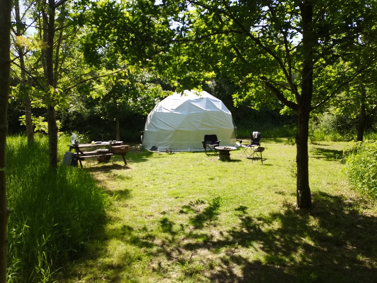 Siyakwamukela ku-Geodesic Dome yethu enhle engamamitha angu-6 enesitofu esivuthayo sezinkuni, umbhede ophindwe kabili nemibhede eyisitezi Izinto zombhede zifakiwe kanye nobhasikidi wezinkuni wokushisa izinkuni. Eduze kwe-dome yakho unekhishi lakho langasese nendlu yangasese, ibhentshi lepikiniki nama-hammocks angasese. Sinendawo enhle yokudlala enama-swings, islayidi, i-sandpit negumbi lemidlalo yangaphakathi elinomdlalo othambile. Ukuhamba ngezinyawo okufushane uzothola ikhishi elihlotshiswe ngokugcwele lomphakathi negumbi le-shower elizimele.