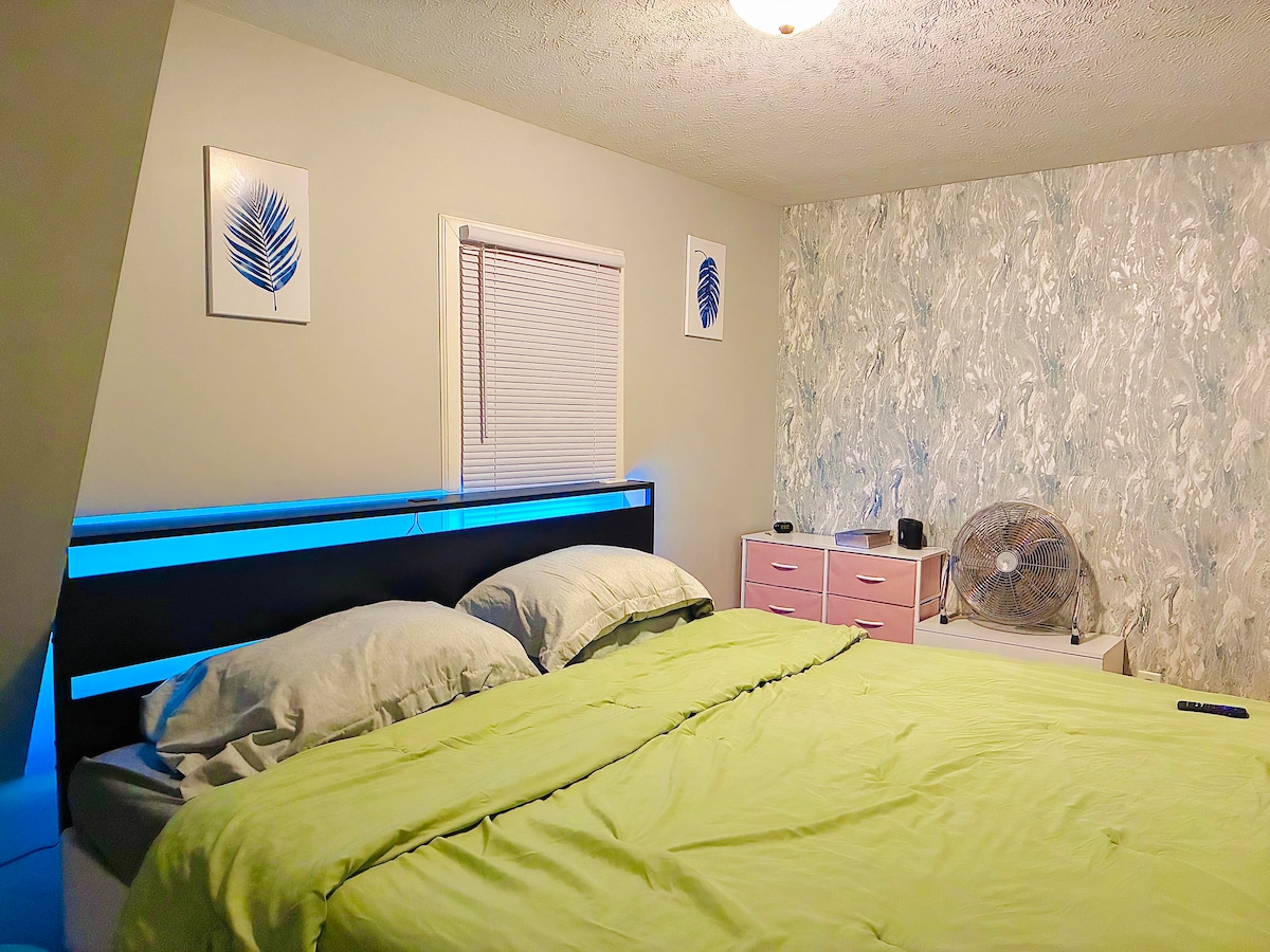 Isethingi yezwe. Ifulethi ngenhla kwegalaji lethu. Kunamathiselwe endlini yethu. Akubhenywa. Azikho Izilwane Ezifuywayo. Azikho Amaphathi. Ayikho indawo ehlanganyelwayo kodwa ngodonga oluhlanganyelwayo, lapha uzozwakala usendaweni yethu kuhlanganise nomnyango wegaraji, amazwi, umsindo wasekhishini, izinja zingakhonkotha, njll. sizama ukugcina amazinga omsindo ephansi kodwa sihlala lapha futhi ungase usizwe. I-WiFi kule ndawo ngezinye izikhathi iyabonakala.