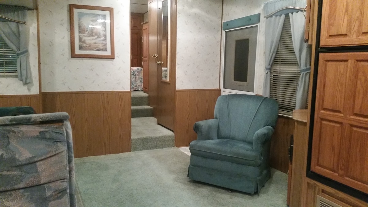Umahamba-nendlwana olungiswe kabusha ngamamitha angu-40. Umahamba-nendlwana upakwe ngemuva kwendlu yethu ngemuva kocingo lwethu lwephrayivesi phezu kwesigodi sehlathi. Jabulela isethingi yezwe ngenkathi usene-wifi engu-150 mb. Imizuzu engu-5 ukuya e-Knightstown, imizuzu engu-45 ukuya e-Indianapolis nemizuzu engu-10 ukuya e-I70. Umahamba-nendlwana une-heater yamanzi ashisayo engenawo amathangi, umshini wokuwasha izitsha, umshini wokuwasha nowokomisa. Usofa wegumbi lokuphumula usonga phansi embhedeni nasekamelweni likamatilasi womoya. Maphakathi nendawo yokukhempa kune-futon esonga phansi embhedeni.