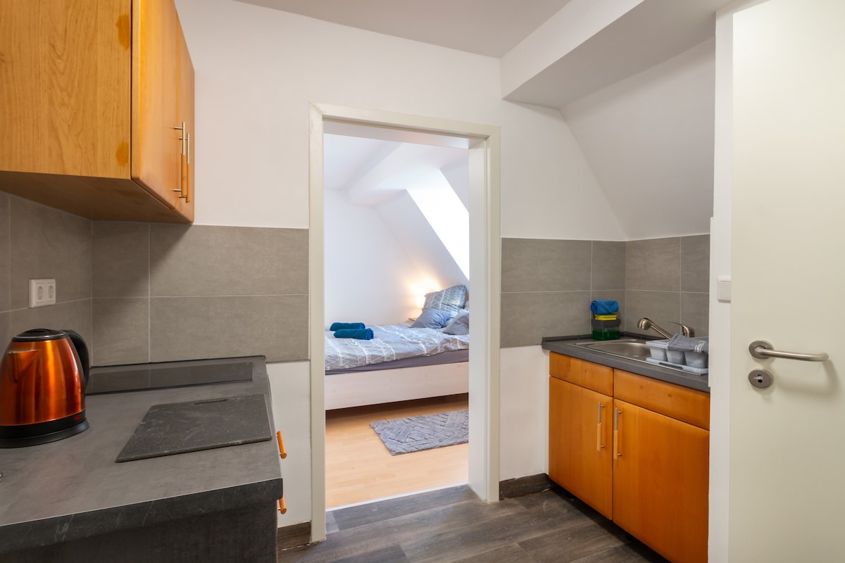 31 m² studio apartment with terrace ♥ Queen-size bed & high-quality sofa bed for 2 additional guests ♥ Terrace with seating area & private barbecue ♥ Modern, fully equipped kitchen including microwave & coffee machine ♥ Cosy dining area for up to 4 people ♥ Smart TV with Disney+ & fast WiFi access ♥ Stylish bathroom with XXL shower ♥ Baby cot & high chair available ♥ Washing machine & dryer in the house for free use ♥ Free parking spaces 200 metres away