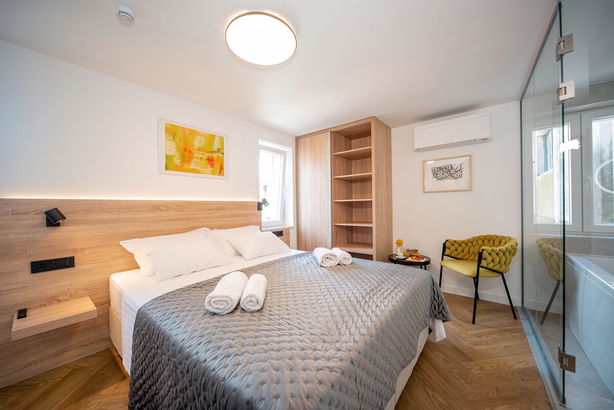Deluxe Boutique Room with Private Jacuzzi, located in the city center, in the center of Split old town, UNESCO world heritage site. Ifakwe ngokuphelele, ine-air conditioning, i-Inthanethi YE-WI-FI, i-LCD TV enamashaneli ekhebula, namafasitela angangenisi umsindo. INDAWO EPHEZULU, iseduze nakho konke!