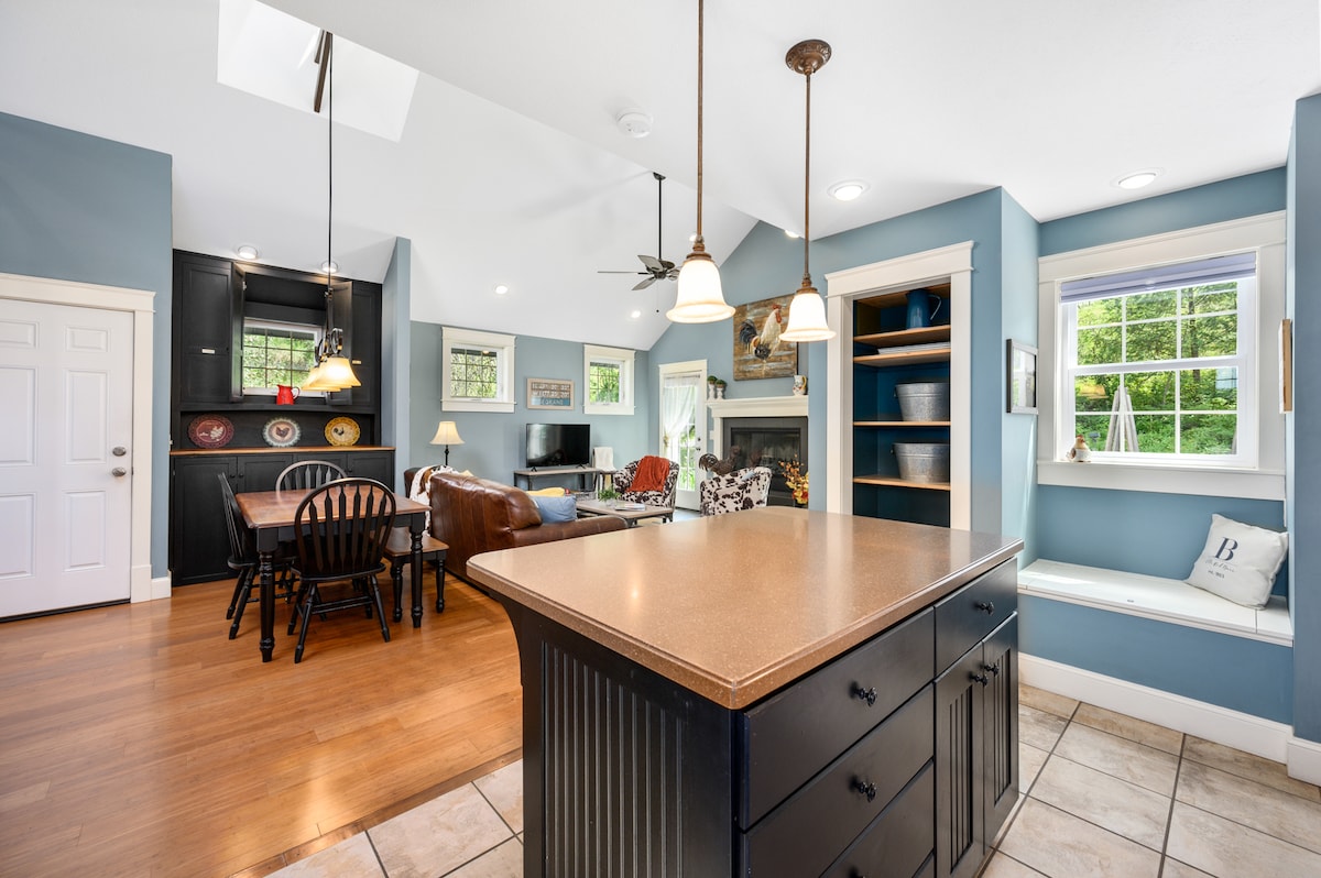 Phumula nomndeni wonke kule ndlu eyakhiwe ngamapulangwe enokuthula neyingqayizivele ehlathini! Indawo yethu iyindawo yokuphumula ngasemlilweni, uhambe egqumeni elihle lendlu yethu, udlale imidlalo yebhodi, uphumule kuma-hammock, ube nezinyoni ezicula, ubone ukushona kwelanga ezintabeni ngesikhathi izingane zakho zidlala endaweni yokubuka izinkanyezi. Uhambo olufushane oluya e-Greenbluff ukuze uthole izivande zendawo, izindawo ezinhle ezisezintabeni, izindawo zokukhiqiza iwayini, izindawo zokukhiqiza utshwala, imikhosi yasekwindla/entwasahlobo. Joyina ama-workshop ethu ebharneni lobuciko. Ebusika, indawo emangalisayo yokuhamba eqhweni esayithini noma ukushayela uye emathafeni okushushuluza.