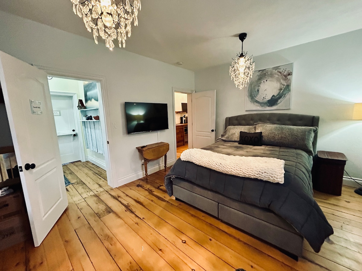 Welcome to your perfect couple’s getaway! This modern upper-level apartment offers a open-concept layout with a fully equipped kitchen, sleek bathroom, and a cozy living space featuring an inviting fireplace. The space includes a small but comfortable bedroom, along with a functional office area for remote work or quiet reading time. Whether you're looking for a romantic weekend escape or a peaceful home base while exploring the area, this stylish apartment offers comfort, privacy, and charm.
