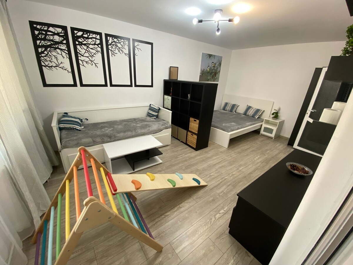 Ifulethi lesimanje, elithokomele eliqhele ngemizuzu engu-15 ukusuka enkabeni yedolobha lase-Iaệi (i-Palas & Palatul Culturii), elisendaweni ethulile, elungele umndeni enamalinki ezokuthutha zomphakathi alula. ✨ Ilungele umsebenzi osekhaya – indawo yedeski 🐾 Kulungele izilwane ezifuywayo – yiza nenja yakho, ikati, noma i-hamster! I-Wi-Fi ☕ yamahhala, indawo yokupaka nekhofi (yebo, ngempela!) 🌿 Vula isakhiwo ngama-pastel athambile, azolisayo 🛏️ Umbhede othokomele, amalineni ahlanzekile nomatilasi wekhwalithi Ukuhlala kwakho okuthokomele kwe-Iaệi kuqala lapha – ngingathanda ukukubungaza!