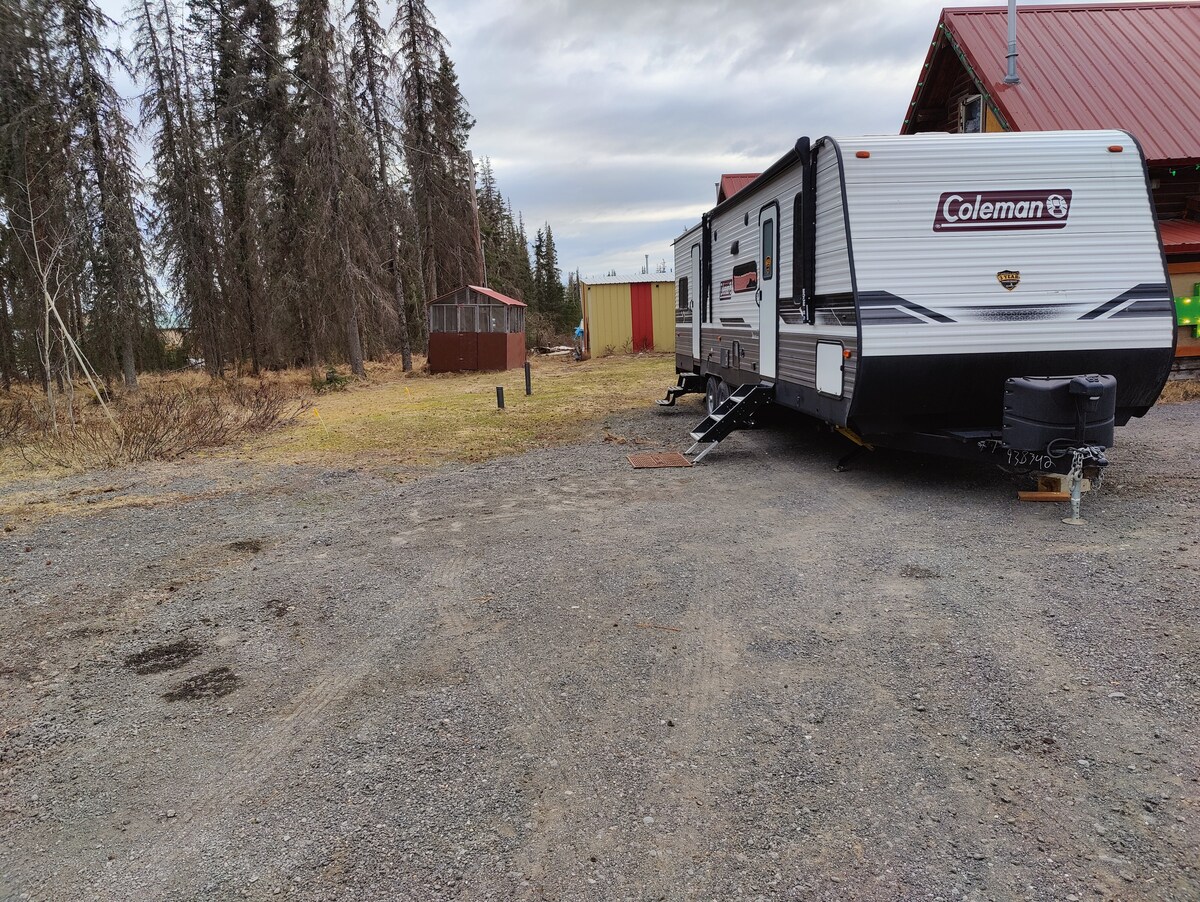 Indlu engu-20 Acre Iyindawo yasemaphandleni yase-Alaska ngezinga elihle kakhulu. Inethezeke☺️ kakhulu i-42 ’5 wheel RV enezicathulo ezinkulu ezingu-3 zokushununuza edala isikhala esikhulu.. gcwalisa ngazo zonke izinto eziyinhloko. Ikamelo lokulala eliphambili linombhede omkhulu, ikamelo lesibili litholakala ngemuva kwe-RV futhi linomatilasi omkhulu. Kukhona usofa ovulekayo endaweni eyinhloko nendawo yokulala eyisitezi ngenhla kwegumbi lokuphumula. Indawo enhle yezingane. Ikhishi eligcwele elinendawo yokudlela ethokomele. Indawo evulekile ngaphandle yokuba namatende ambalwa!