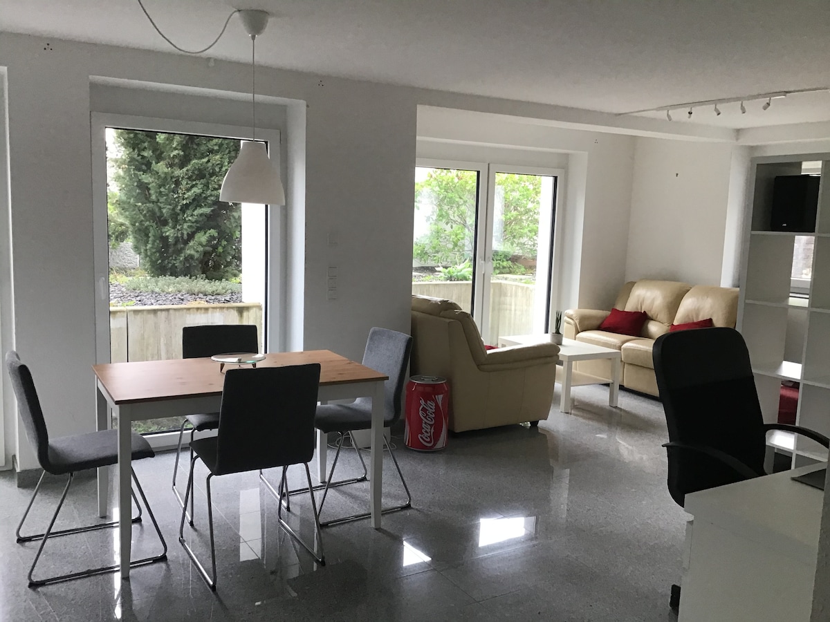 Ifulethi elinefenisha enambithekayo elinegumbi lokugezela le-chic negumbi lokugcina impahla. Ikhishi elinakho konke. Ukuthula etholakala ezinyaweni ze-Hasenberg e-Süd (Heslach) nazo zonke izinzuzo zedolobha: eduze nendawo cishe imizuzu engu-7, imiz engu-19. kuya endaweni yokuhweba kanye nesikhumulo sezindiza noma imizuzu embalwa ngezinyawo ehlathini kanye ne-Bihlplatz metro stop.