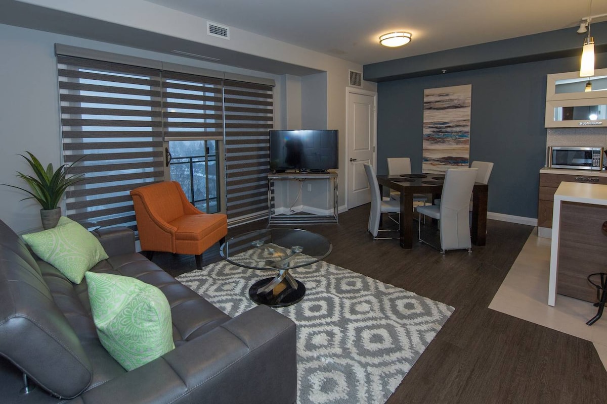 Welcome Home to our Executive One Bedroom Suite at our Luxury Nesbitt Drive location. At our neighbourhood of buildings, this modern suite is the finest stay that Sudbury has to offer. Our suites are masterfully designed with modern finishes, large open concept rooms and creative uses of space. Building amenities include on site fitness centre, executive boardroom and social room. Our location allows guests to easily commute to local attractions, outdoor spaces, shopping and institutions.