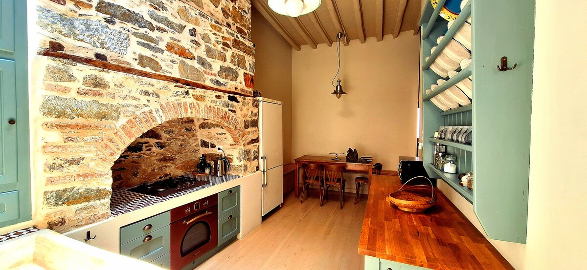 Indlu yasedolobheni efakwe ngo-1870 enkabeni ye-Ermoupolis. Sonke isitezi sesibili, esilondoloze izivakashi zethu, igumbi elivulekile nelinelanga elinombono okhangayo phezu kwedolobha nolwandle lwe-Aegean. Inamakamelo angu-2, igumbi lokugezela elilodwa, igumbi lokuphumula elinokufinyelela kuvulandi nekhishi. Esitezi sesithathu kukhona ithala elikhulu. Le ndawo ilungele imindeni, imibhangqwana noma iqembu labangane futhi konke kusebangeni elifushane lokuhamba ngezinyawo.
