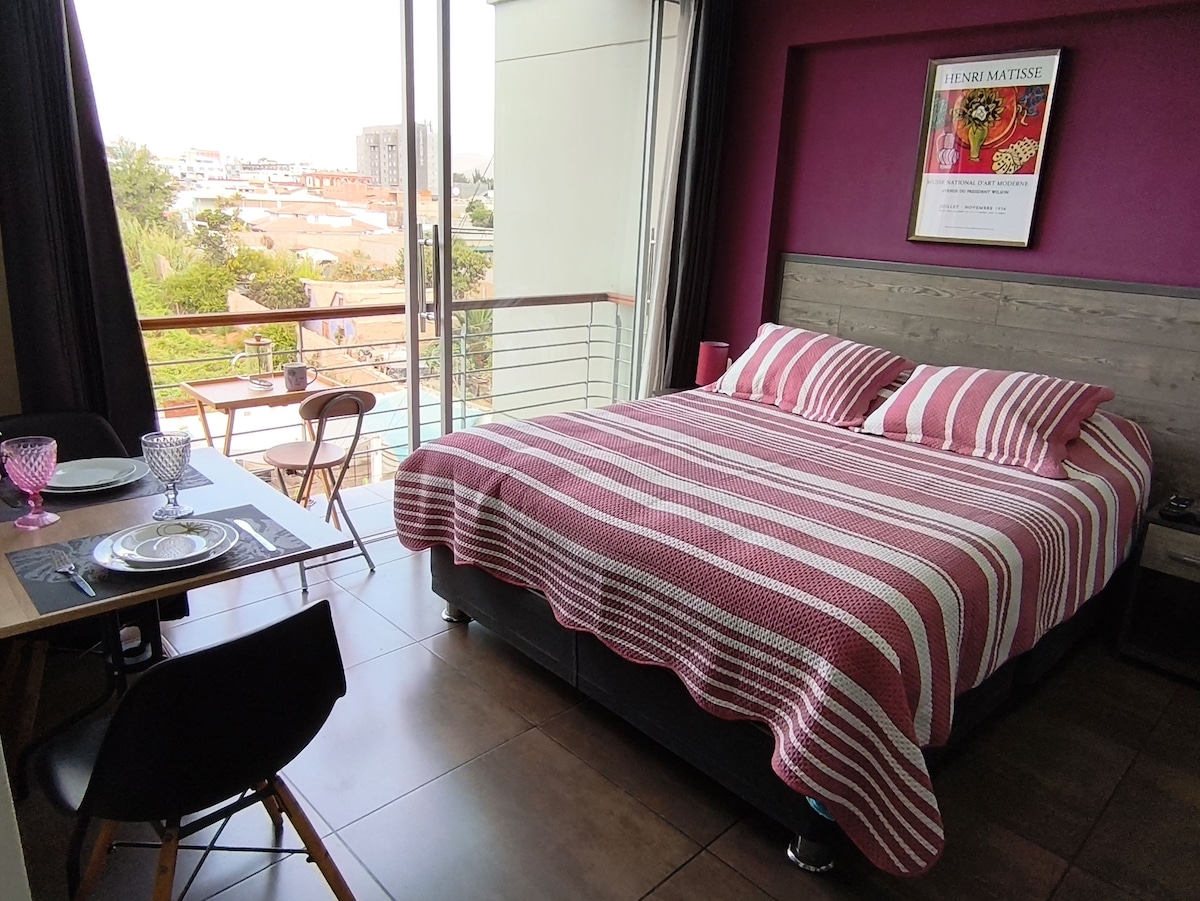 CÉNTRICO APARTAMENTO ESTUDIO DE 25 m2, muy cerca de comercios y lugares de interés, cómodamente amoblado, cuenta con kitchenette equipado, frigobar, mesa comedor, cama Queen, TV 43" con canales de cable, servicio higiénico privado equipado con tocador y ducha con hidromasaje. También cuenta con balcón y excelente vista de la ciudad, lavadero y tendal propio, armario, WIFI, caja de seguridad. Propiedad ubicada en quinto piso, con acceso independiente solo por escaleras amplias y con pasamanos.