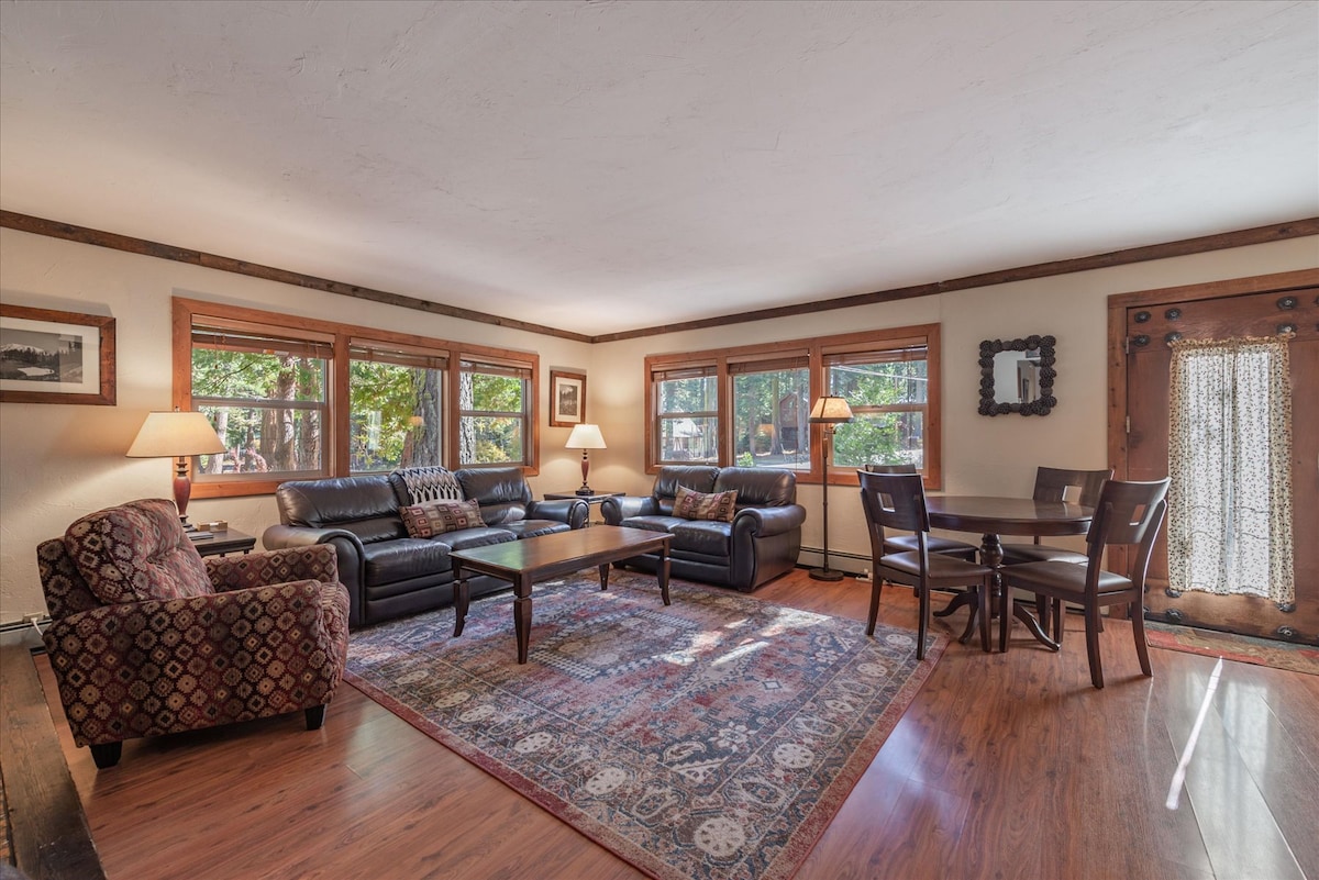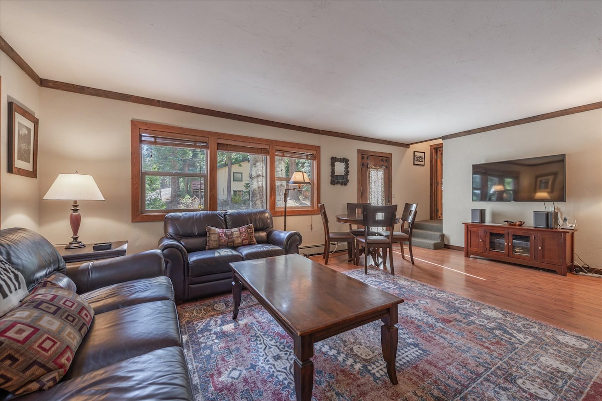 Siyakwamukela endlini yethu eyakhiwe ngamapulangwe e-West Shore of Lake Tahoe. Indlu yethu eyakhiwe ngamapulangwe ilungiswe ngothando, ebonisa manje njenge-Old Tahoe "Indawo ephelele yezemidlalo yasebusika eduze kwe-Squaw & Alpine Ski Resorts & imizuzu eya e-Homewood Ski Resort. Ezinyangeni ezifudumele, jabulela ukuhamba ngezinyawo okufushane ukuya ebhishi elingaphambili lechibi kanye nebhuloho lokubhukuda nemidlalo yamanzi noma ujabulele amamayela aphephile ebhayisikili eliseceleni kanye nezindlela zokuhamba ngezinyawo noma uhamba uye emizileni esizungezile kuhlanganise ne-Eagle Rock. Eduze nezitolo zokudlela ezinhle ne-Tahoe City
