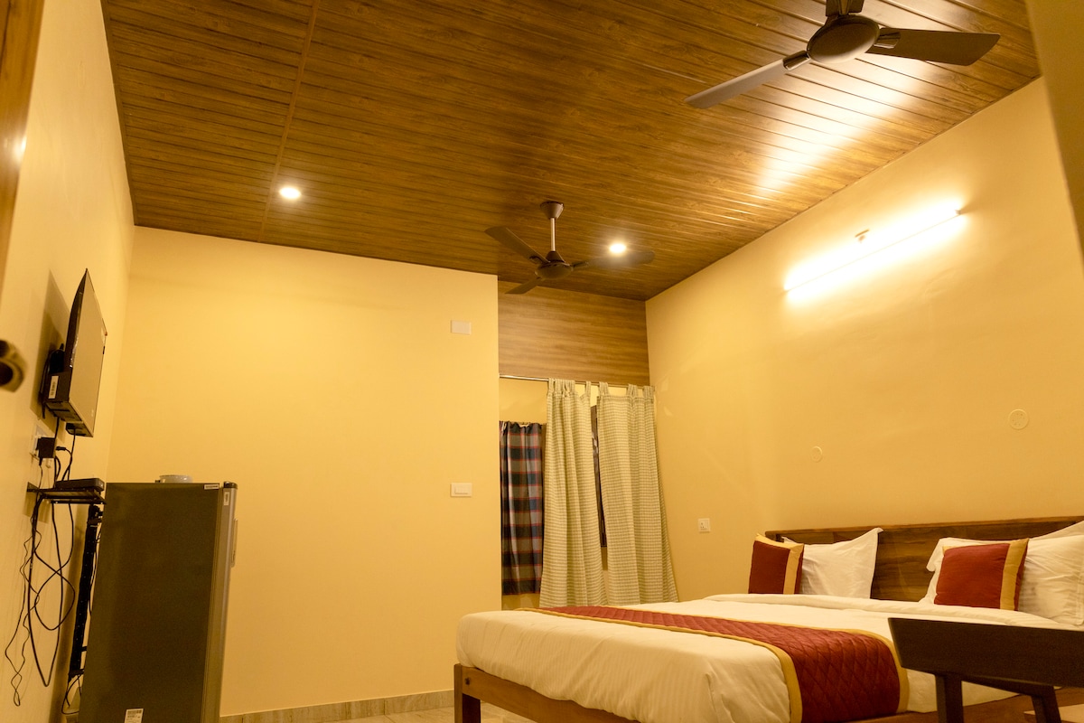 Discover serenity in the Mantra Cottage room at Mantra Koodam. Step onto a charming small verandah, embracing the outdoors. The open-air bathroom invites nature in, offering a unique experience. The cozy bedroom completes the retreat, ensuring a tranquil stay in harmony with the surroundings.