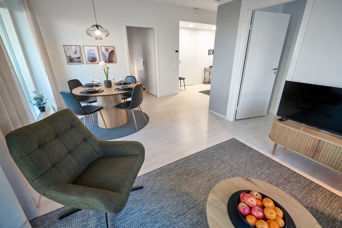 Leli khaya elisendaweni enhle kakhulu linokufinyelela okulula kukho konke. Isiteshi sesitimela siseduze futhi i-Nokia Arena iqhele ngamamitha angu-500 kuphela. Amafasitela efulethini abheke egcekeni, ngakho ifulethi linokuthula okukhulu uma liqhathaniswa nendawo elikuyo. Ikhishi linakho konke futhi isiqandisi sihambisana nomshini wokwenza iqhwa ukuze kuqinisekiswe ukubanda kweziphuzo. Isici esingcono kakhulu sefulethi yi-sauna yangasese, lapho ungathatha khona isitimu ngemva komsebenzi noma usuku lokuphumula.