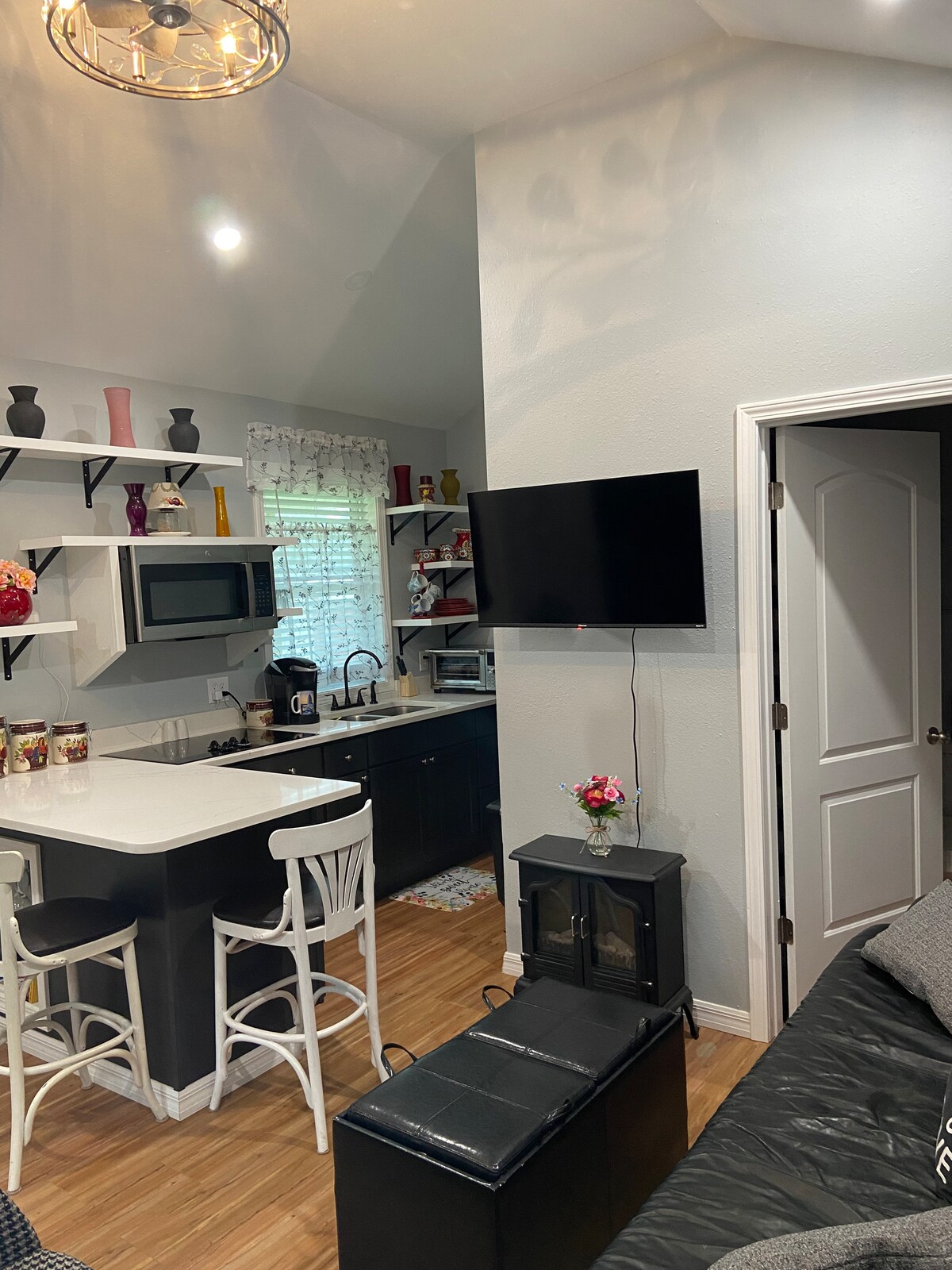 Enjoy the sounds of nature when you stay in this unique place. Shade trees can be seen through the fixed windows near the cathedral ceiling. Feels as though you are in a treehouse! Bedroom has one queen bed & can be closed off from kitchen & living room. House is new and within a fenced yard. It’s to the rear of owner’s home and backs up to a flower nursery. Very quiet. Great place to study, work online, or just relax. Swing on Front Porch. Pets for short term. No cats.