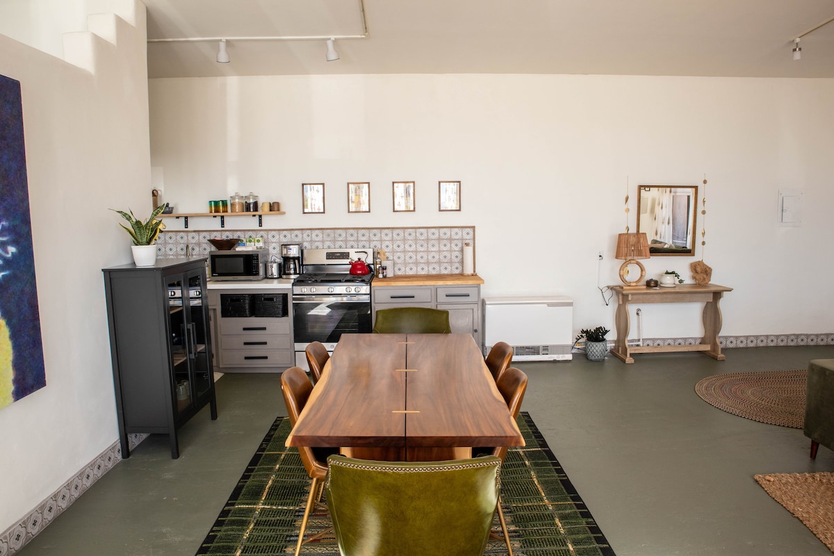 Jabulela izakhiwo ezingavamile i-Taos edume ngazo kule dome enhle, egcwele ukukhanya. Le ndawo enhle, enobuciko isendaweni engamakhilomitha angu-3 e-NE yedolobha, enokufinyelela okulula kuzo zonke izindawo ze-Taos-The Gorge Bridge, i-Taos Pueblo, i-Taos Ski Valley, i-The Plaza, ne-Hiking. Vula umzila wokuhamba esibhakabhakeni uphume emnyango! Kusemizuzwini engaba ngu-12 ukusuka edolobheni. Siyakwamukela kwelinye lama-Airbnb okuqala futhi ahamba phambili e-Taos!
