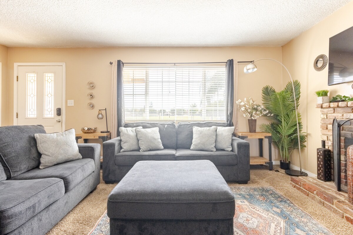 Jabulela ukuzola kule ndawo ezolile emizuzwini engu-10 ukusuka edolobheni elingena kalula emgwaqweni omkhulu. Ukuthenga nokudla okuningi kungakapheli imizuzu embalwa ngemoto. Le ndlu engemuva enezitezi ezimbili isendaweni engama-1/2 acre, inendawo yokubhukuda enamanzi anosawoti, isihlenga sezingane nendawo yokubasa. I-WIFI YAMAHHALA, ikhishi elinempahla ephelele, indlu yokugezela ephelele, igumbi lokulondoloza izimpahla, igumbi lokuphumula eline-smart tv engu-60", ikamelo elilodwa elikhulu elingaphezulu elingu-600ft² eline-smart tv engu-55". Igumbi lokulala linemibhede emikhulu engu-2/ i-memory foam top. Igumbi lokuhlala line-queen bed edonswayo. Akuvunyelwe amaphathi.