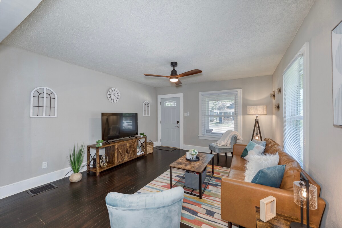 Ngiyakwamukela empilweni encane edolobheni elinokuthula. I-bungalow enamakamelo amabili emgwaqweni othulile. Kusanda kulungiswa. Ifenisha ephelele. Iphansi lasekuqaleni lamapulangwe aqinile, ubhavu omusha wamathayili, inkosi, umbhede wasemini/umbhede wesibili, umbhede omkhulu owusofa egumbini lokuphumula. Ikhishi elikhulu lasemaphandleni elinamaqanda amasha angewona ama-GMO nekhofi elithosiwe endaweni. Ideski elinephrinta. I-Roku TV egumbini lokuphumula. I-inthanethi ye-Wi-fi. Igalaji lokupaka. Igceke elivulekile eline-swing yamathayi. Umpheme welanga. Izilwane ezifuywayo zamukelekile. Hlanza, unethezekile, ulungele ukuba ikhaya lakho lesibili.