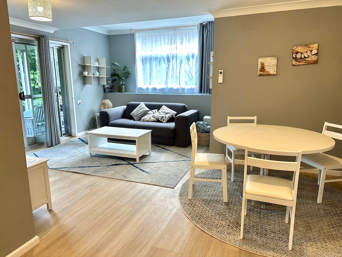 Ukuphumula phansi efulethini lekhaya elizimele endaweni yomndeni enamaqabunga - ngaphesheya komgwaqo osuka epaki elinotshani eliphethwe yi-lagoon egeleza ebhishi lase-Terrigal. Ukuhamba ngomzuzu we-15-20 ukuya ebhishi lase-Terrigal, izindawo zokudlela, ama-pub nama-boutiques. Ifulethi liyikhaya elifudumele nelinobungane elinendawo ephumuzayo. Ngezinye izinsuku ungawuzwa isigqi samagagasi ephukile ebhishi ngebanga.