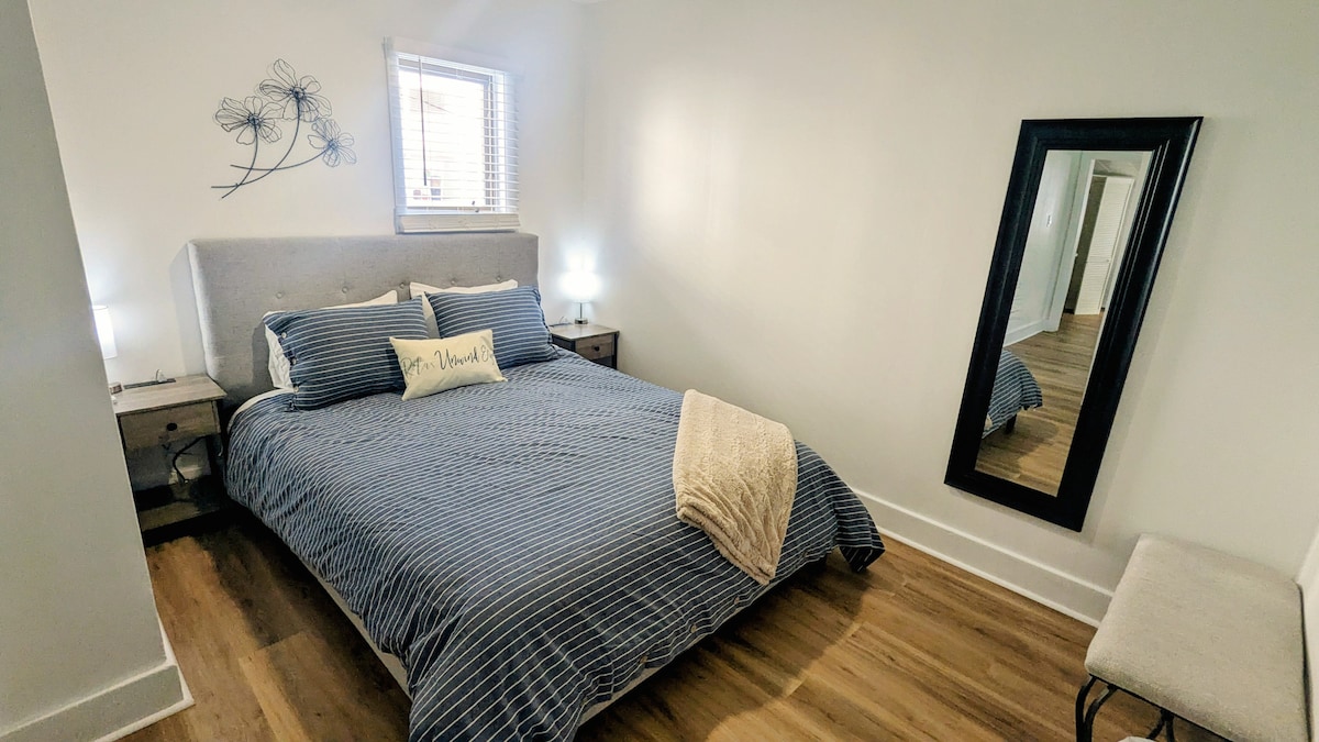 Uyemukelwa Kumakati Amathathu Amnyama. Idizayini yesimanje yamaphakathi nekhulu leminyaka enamakati ekwakhiweni kuphela, hhayi kuyunithi ;) Iyunithi inikeza ukufinyelela kwangasese kuwe wedwa futhi inegumbi elingaphansi elikhanyayo, ikamelo elilodwa elinekhishi elincane, elinakho konke kanye negumbi lokuphumula elinegumbi lokugezela elinezingcezu ezine. Le yunithi isekhaya leminyaka futhi isendaweni ezungezwe amanye amakhaya omlando nepaki. Imizuzu engu-10 ukusuka esikhumulweni sezindiza nomgwaqo omkhulu wase-Canada.