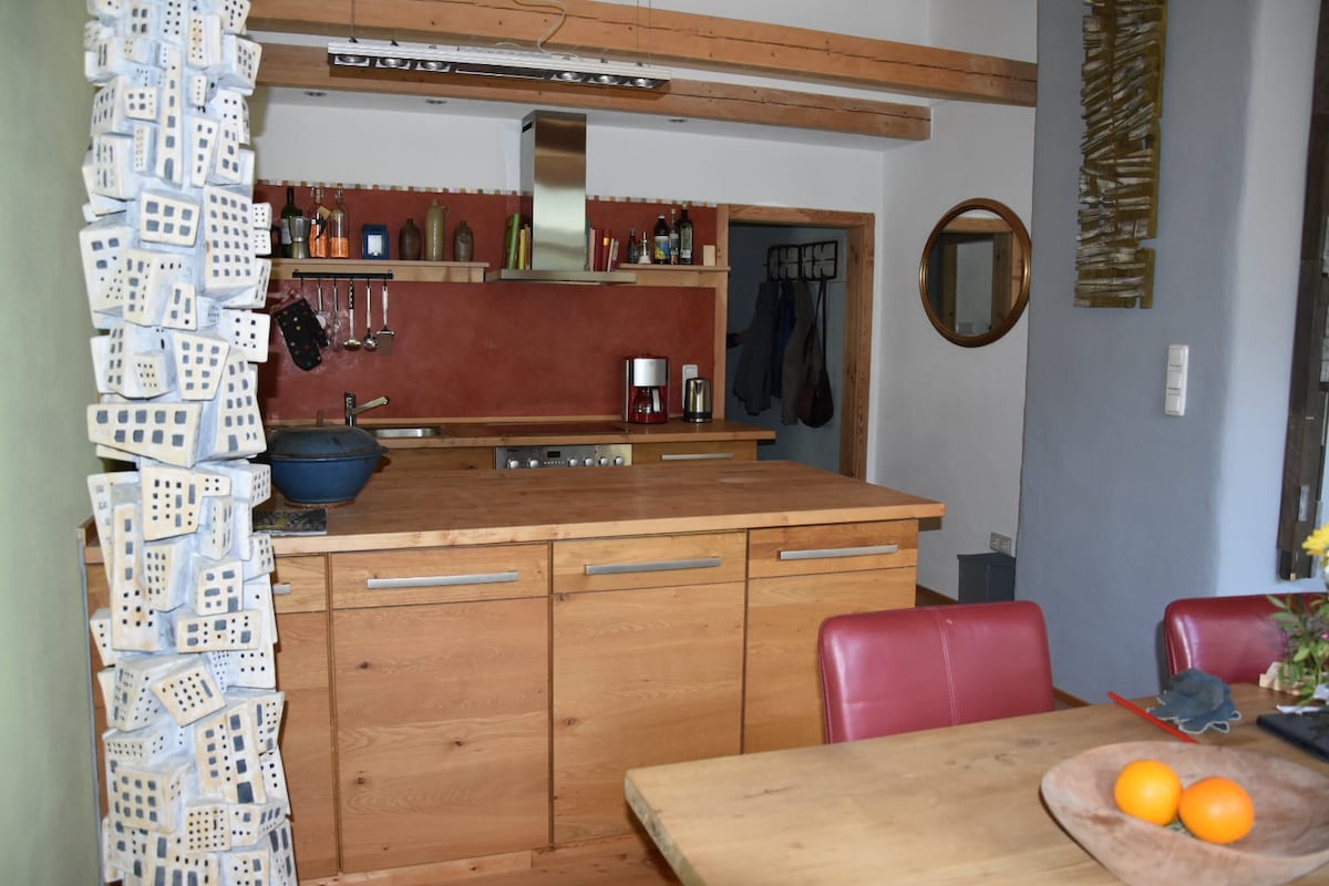 Indlu yethu yemvelo inezinto zokwakha zemvelo ngokuphelele futhi isebenzisa imiphumela yokuhlanganisa ukushisa okukhanyayo namandla elanga. Izinkuni ezingahlotshisiwe zakhiwe ngokuvumelana nesistimu ye-Bio-Solar-Haus, lapho kwakungekho upende noma ezinye izilondolozo zaphroseswa khona. Izindawo zaphansi zokhuni eziqinile kuyo yonke indlu zifakwe amafutha. Ngaphezu kwezinkuni zemvelo ezifana ne-pine yamatshe ne-oki, ezinye izinto zemvelo ezifana netshe lemvelo elivela esifundeni (Jura marble) ziphrosesiwe. Ukwakhiwa kwendlu ye-Bio-Solar kuvumela ukujikeleza komoya ongokwemvelo futhi ngaleyo ndlela kuwukhipha ububi bezinhlelo zokungenisa umoya. Ayikho i-convection eyakhiwe ngenxa yokushisisa nokwakhiwa kodonga. Ukushisisa uhlelo lwendlu ngaphakathi endlini (ngaphandle kwesithiyo somphunga), umphunga wamanzi angahluka ngokukhululekile ngaphandle, obangele ukuthi kungabikho i-condensation nesikhunta. Ngenxa yokushisisa okuphansi kwamandla endlini kanye nokusetshenziswa kwemitha yelanga, akukho amafutha okudingekayo. Amandla elanga umthombo oyinhloko wamandla, kuphela ebusika kungafudunyezwa uma kunesidingo ngesitofu sezinkuni. Isevisi siyajabula ukukulethela imiqulu entsha, i-crispy kanye nesinkwa esihle esivela ku-BIO-bakery ukusuka esifundeni sethu.
