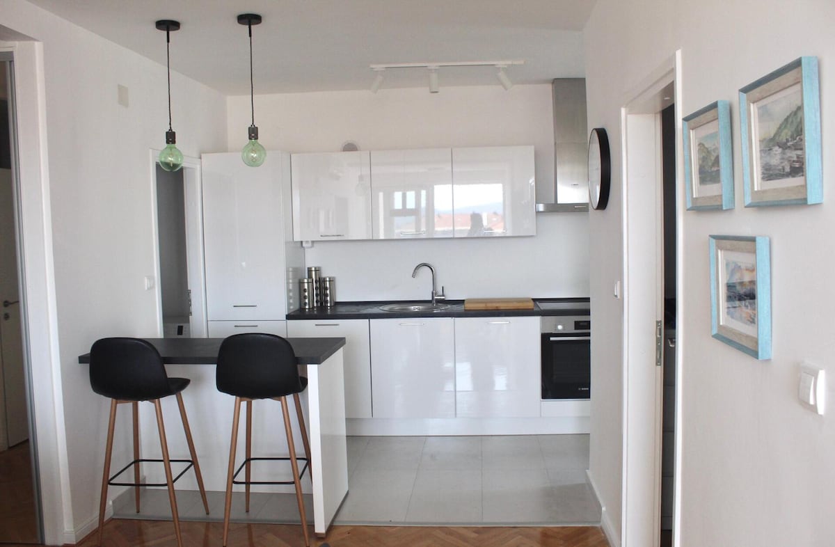 Ifakwe ifenisha ngokugcwele ifulethi elisha langaphakathi lesimanje endaweni yedolobha. Izinyathelo kude ne-Pine promenade/waterfront, imizuzu engu-2 kude ne-Porto Montenegro superyachts marina. Izinhlobonhlobo zezindawo zokudlela, amathilomu, amabha, izitolo ezinkulu namabhikawozi atholakala komakhelwane bayo. Phakathi kwazo zonke izenzo kodwa kude ngokwanele lapho kungeke kuphazamise khona UBUTHONGO bakho. Phawula ukuthi ifulethi lisesitezi SESI-3, elingenalo ikheshi. Nokho, indawo ekuyo ikubeka izinyathelo nje kuwo wonke amasevisi.