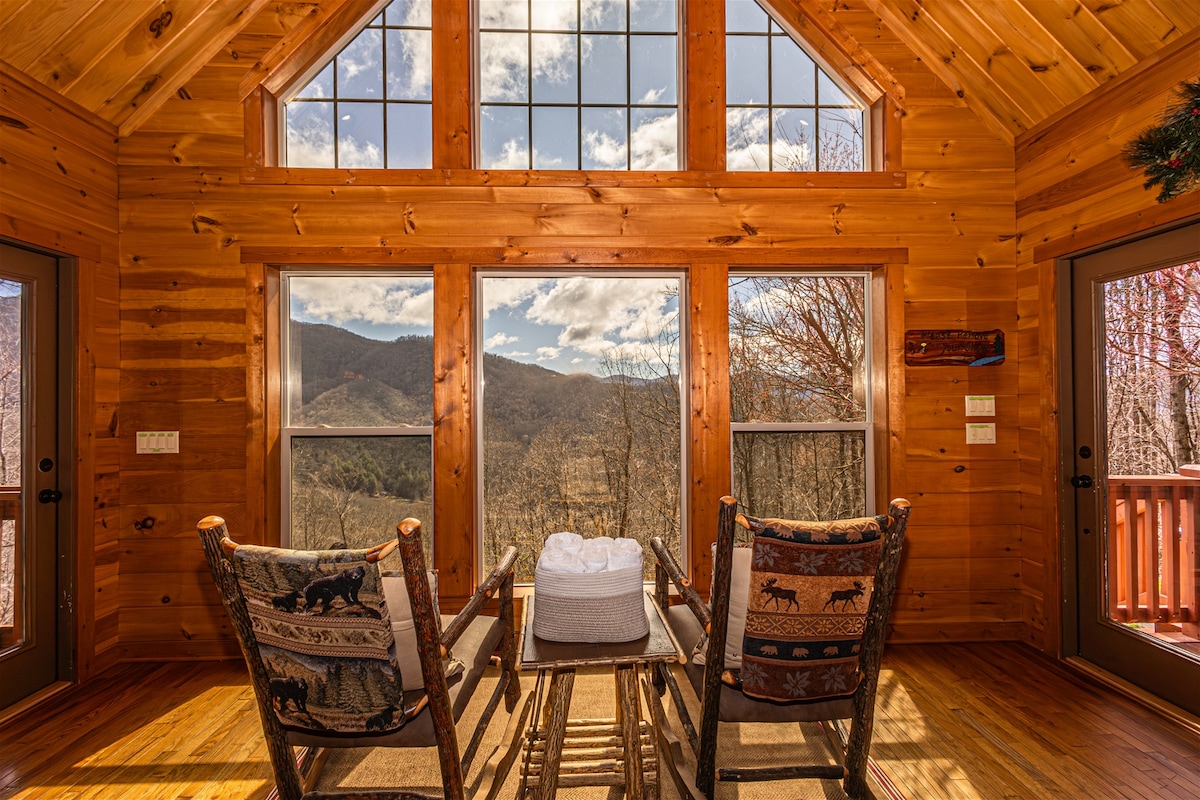 Sivulekile! Hlala kuma-rocker nekhofi lakho lasekuseni, udle ukudla kwakho etafuleni lasekhishini noma uhlale phambi kwendawo yomlilo konke kuyilapho ujabulela ukubukeka okumangalisayo! Ubhavu wamanzi ashisayo usemphemeni obheke i-Mountain View enhle. Sisemizuzwini engu-20 ukusuka e-Bryson City nase-Nantahala Outdoor Center, imizuzu engu-10 ukusuka e-Tsali Recreation, imizuzu engu-25 ukusuka e-Smoky Mountain National Park, e-Cherokee nase-Blue Ridge Parkway. Kunencwadi endlini eyakhiwe ngamapulangwe enezinye izincomo